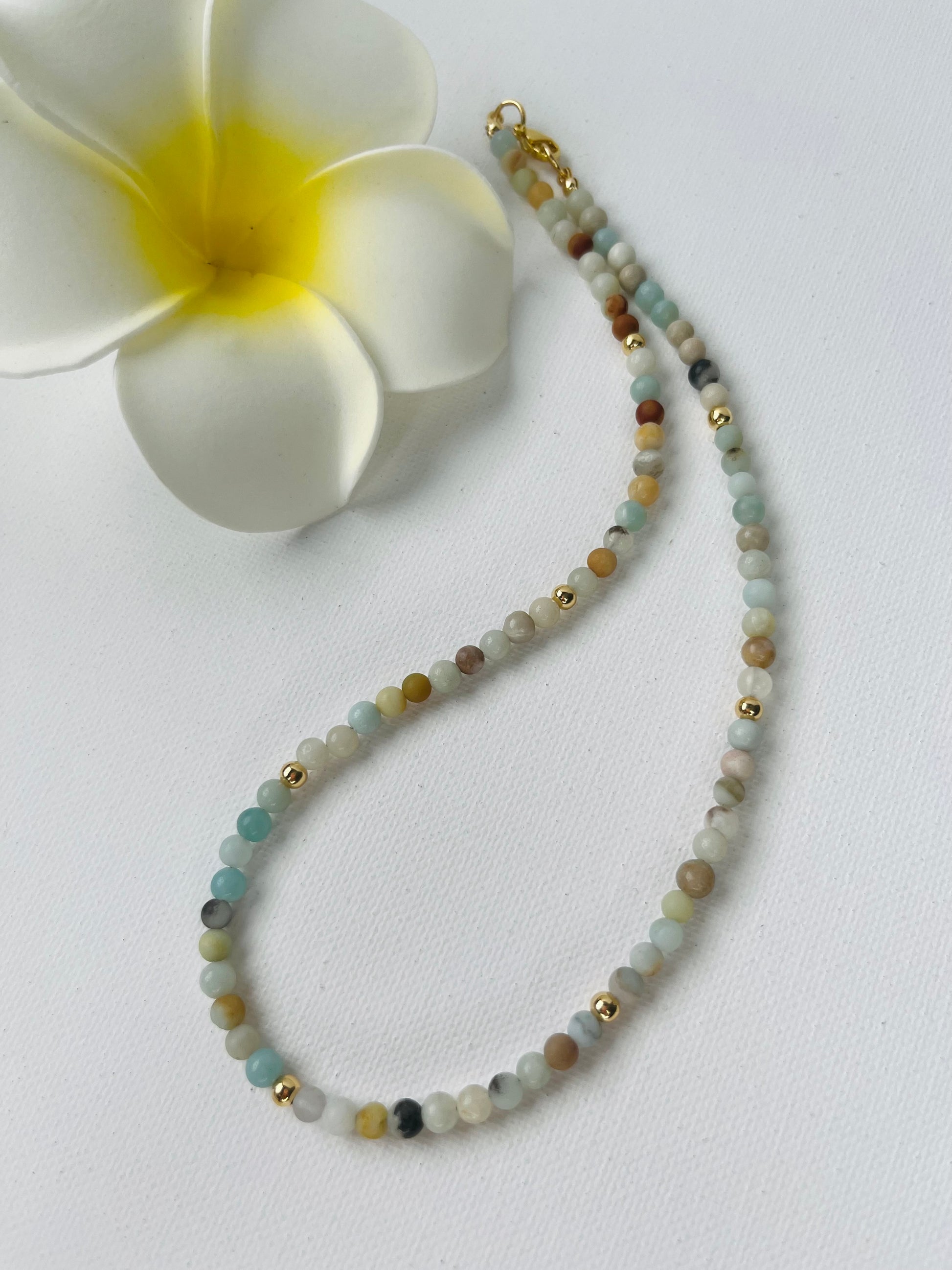 Natural stone necklace made of amazonite stone and gold plated beads. Measures 15 inches long. Not ajustable.
