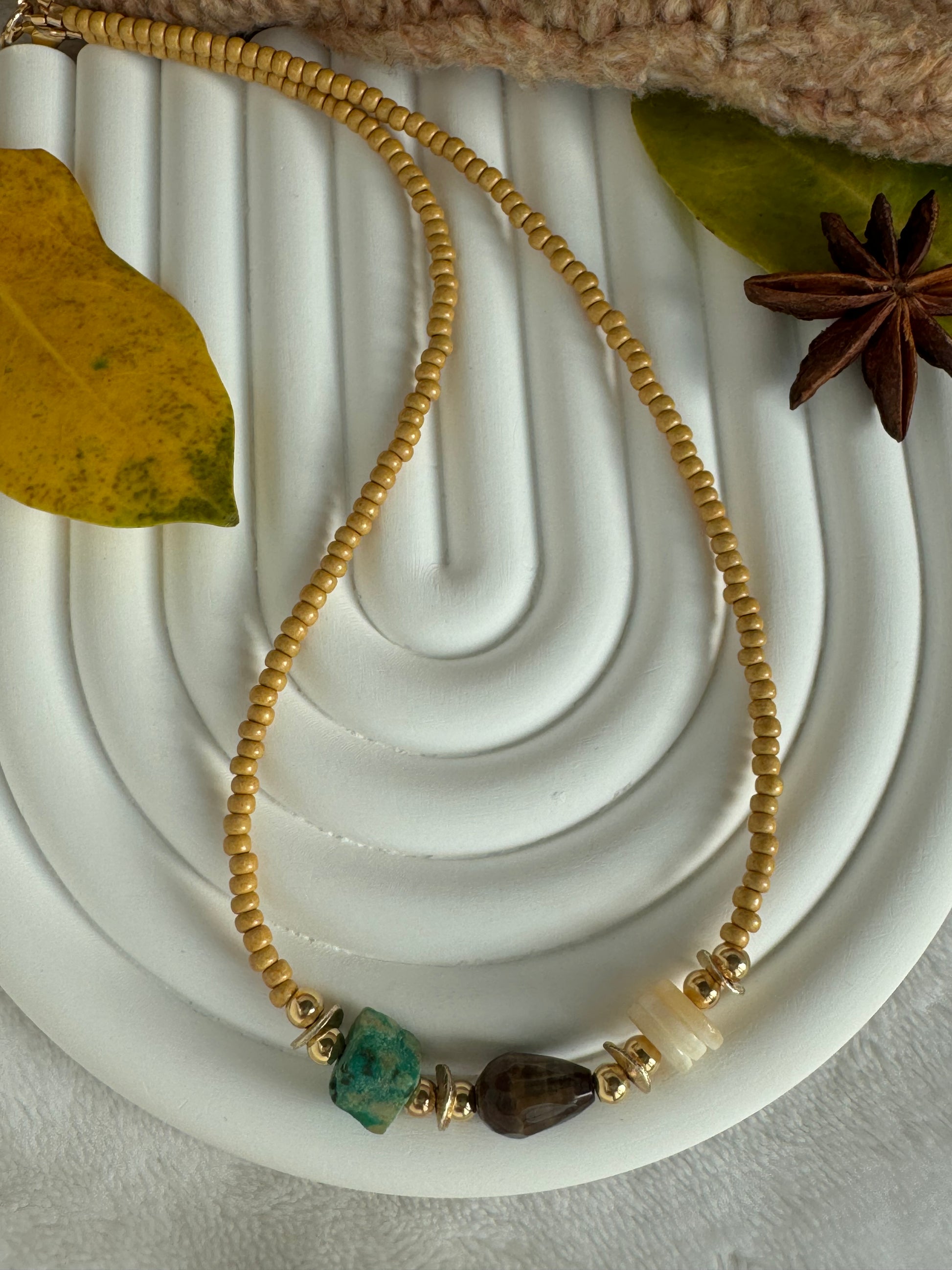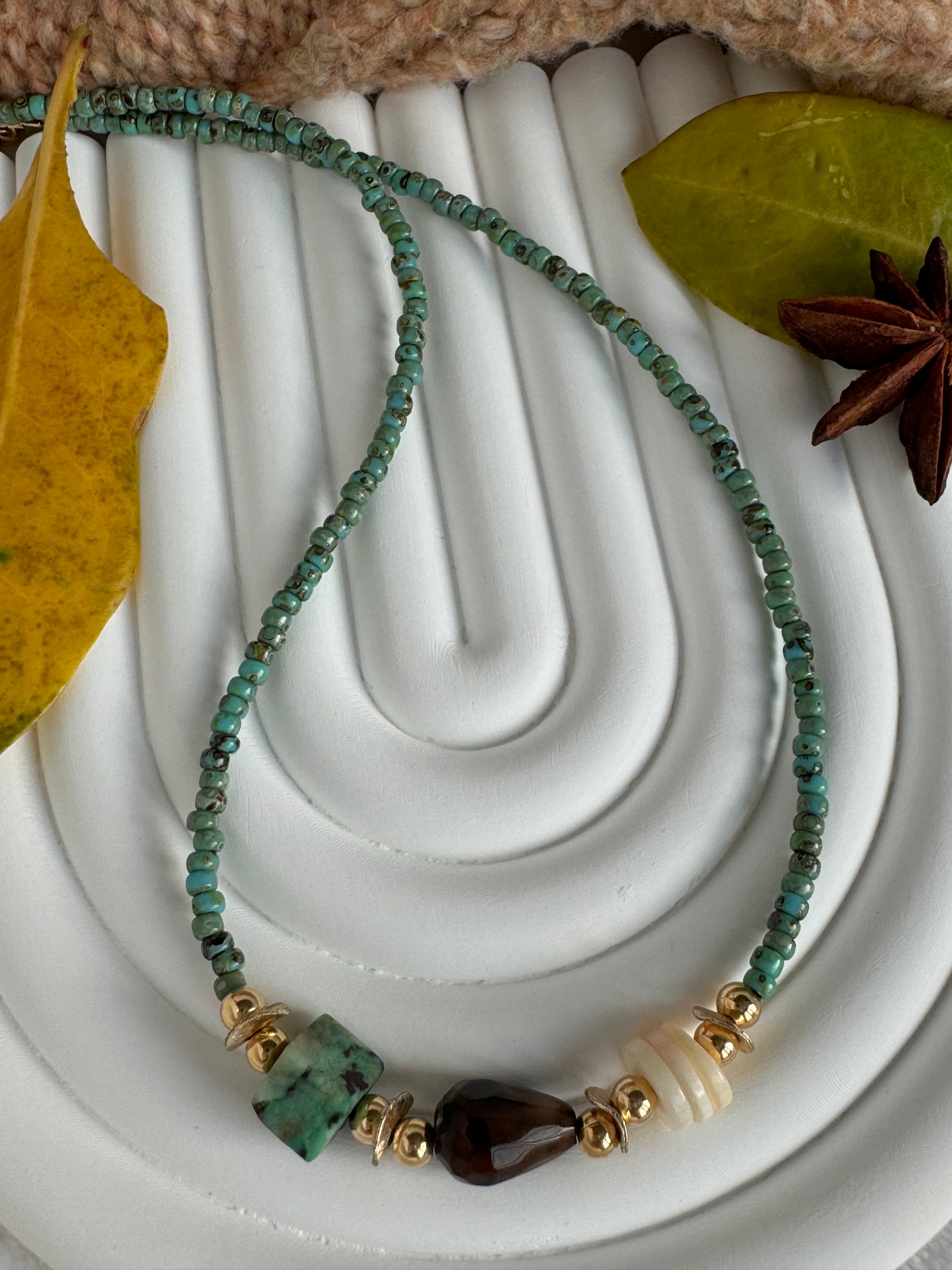 Material: Miyuki, African turquoise beads, ágatas, freshwater Shell Heishi and gold plated beads.