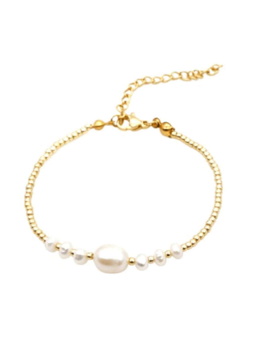 Stainless steel beads and fresh water pearls. Measures 6-8 inches long