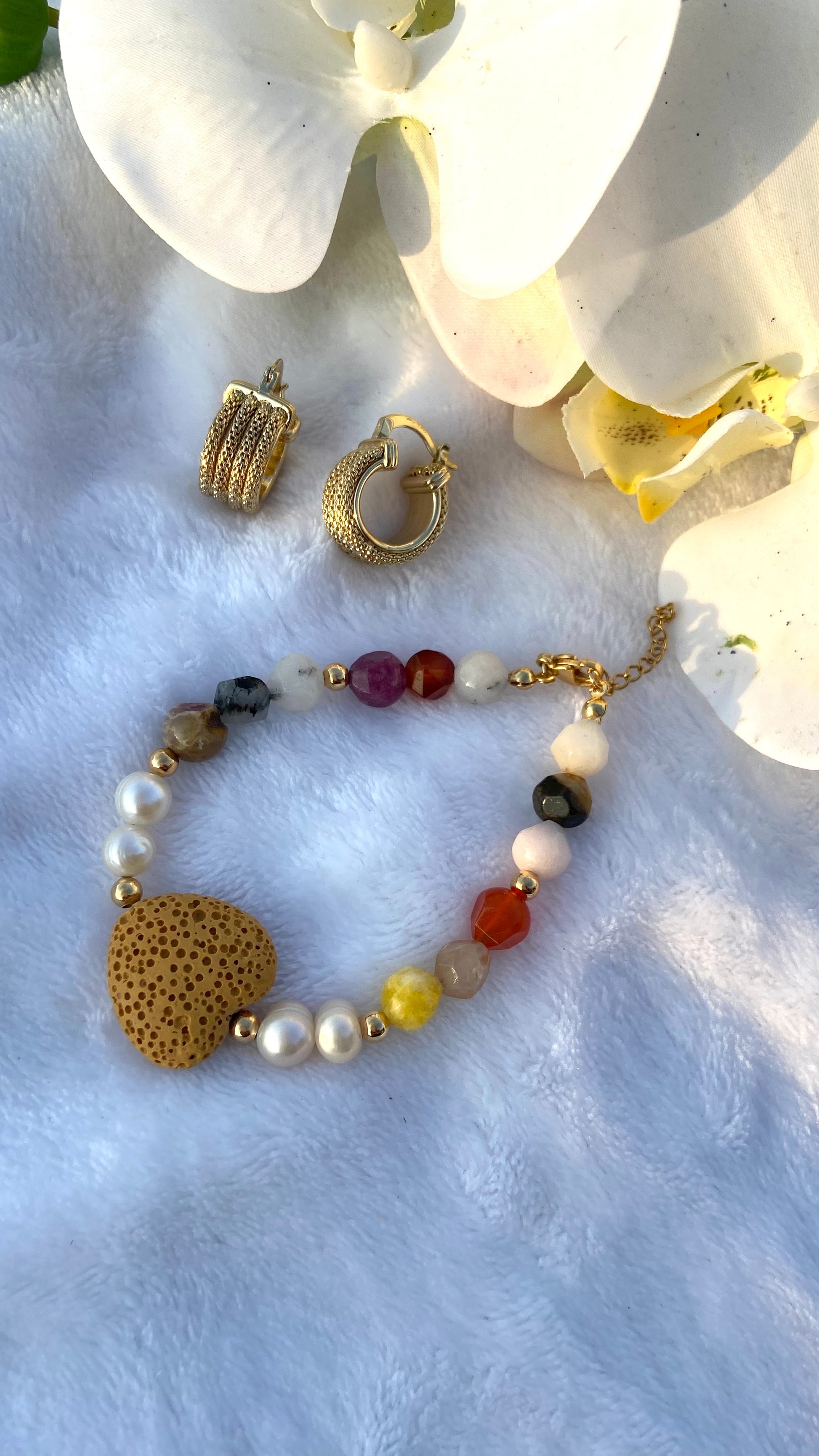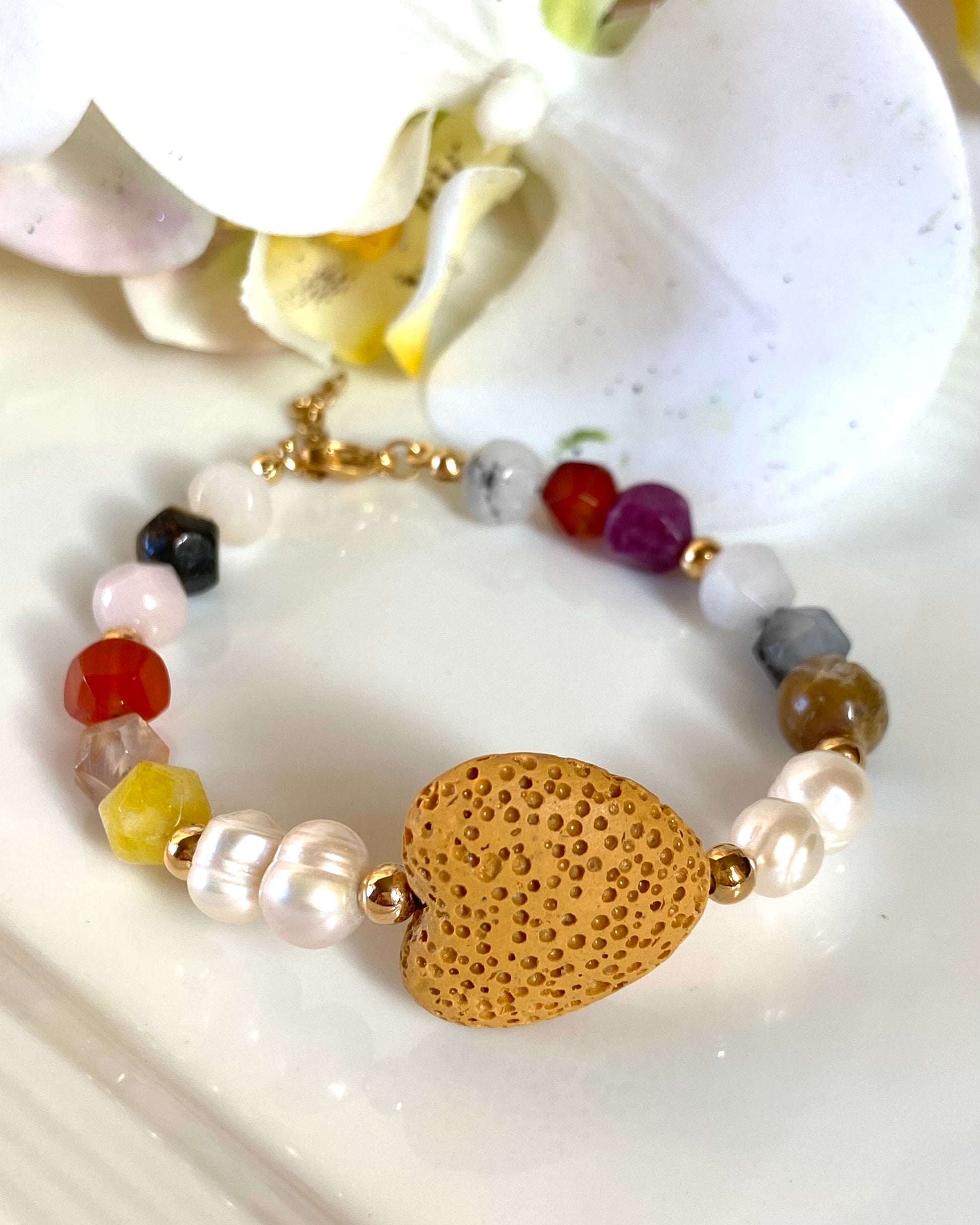 Made of gemstones, fresh water pearls and 14k gold plated accents.