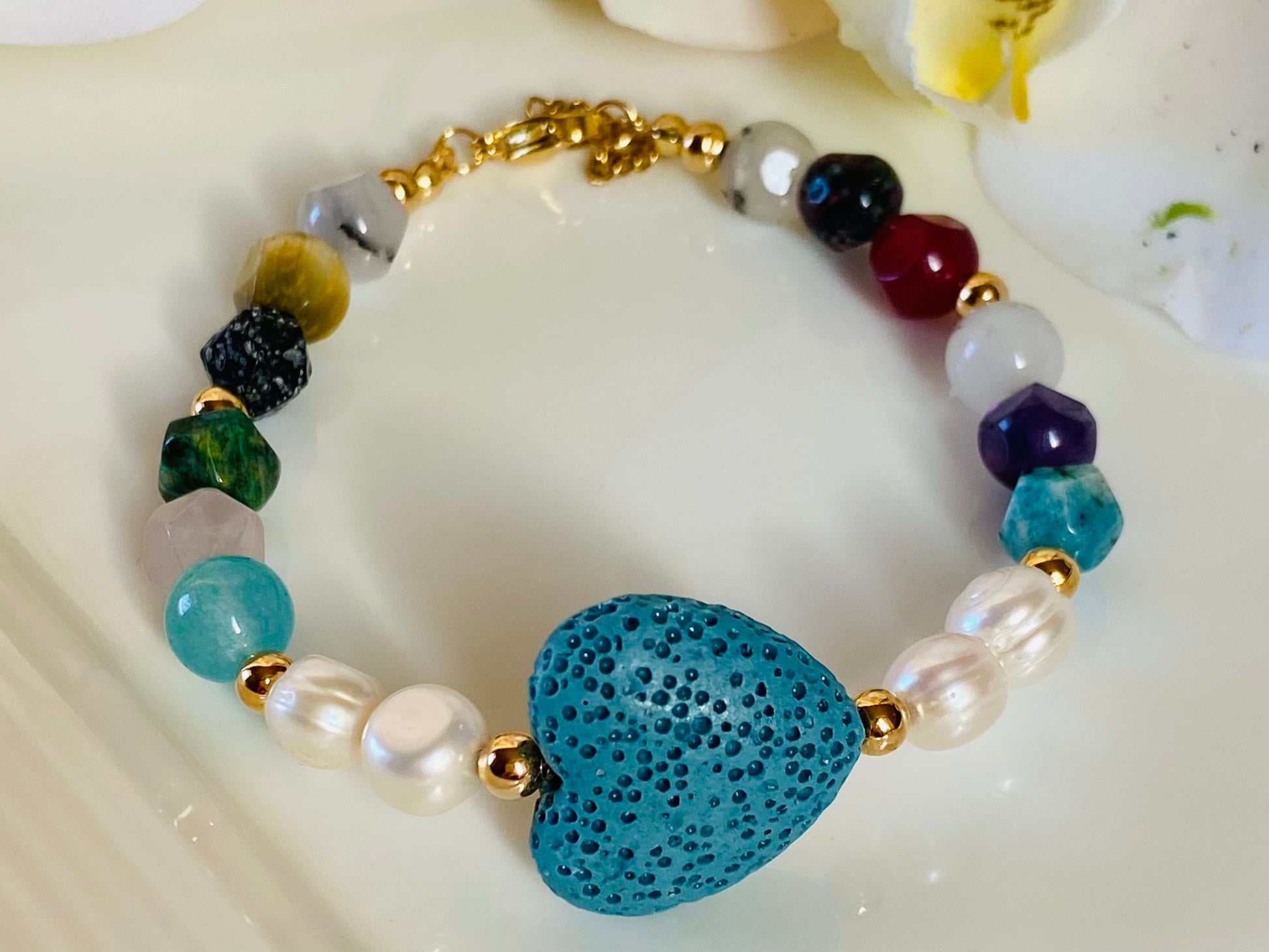Made of gemstones, fresh water pearls and 14 k gold plated accents.