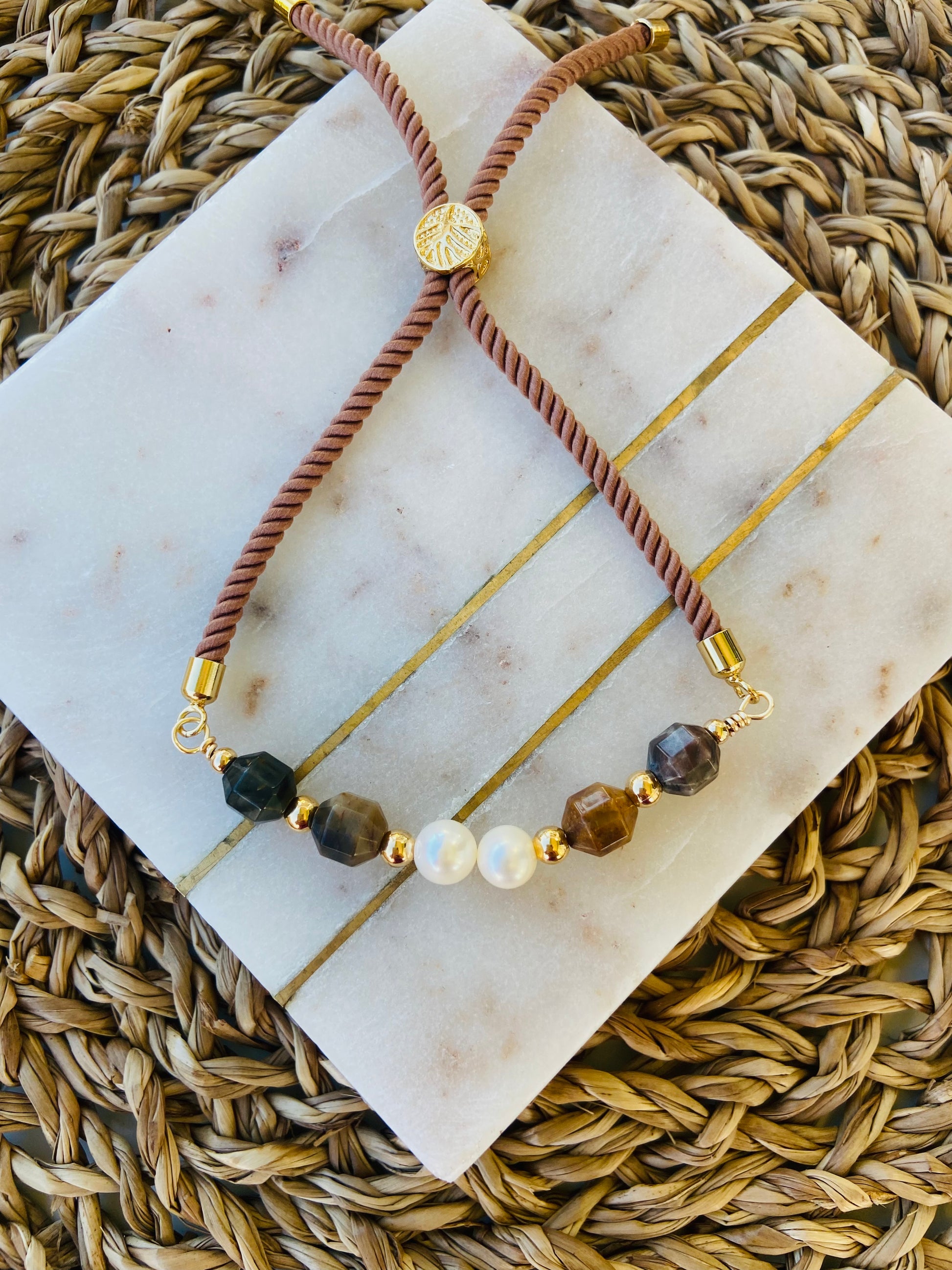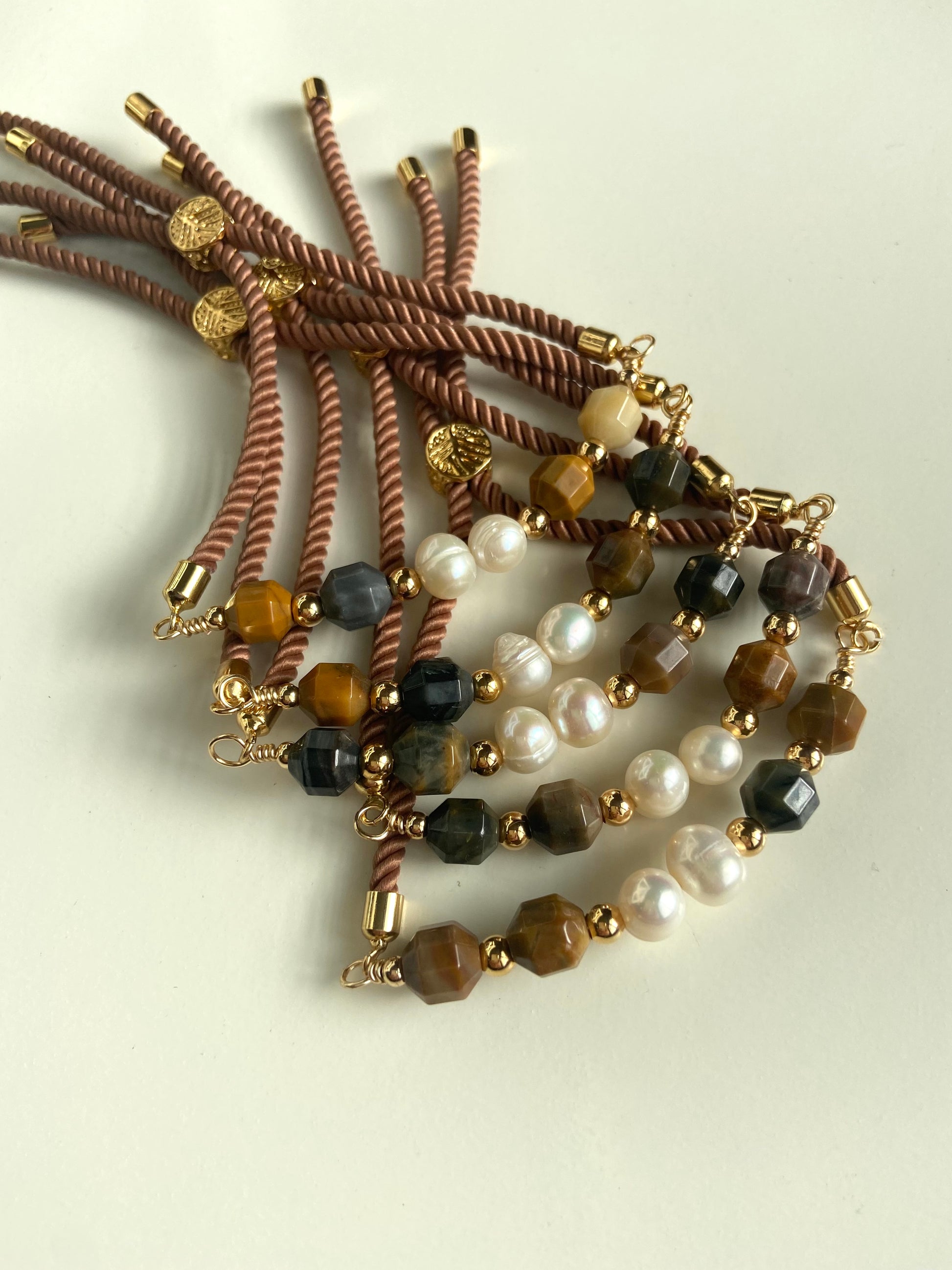 Ajustable bracelet made of Jasper beads and fresh water pearls with gold plated beads.