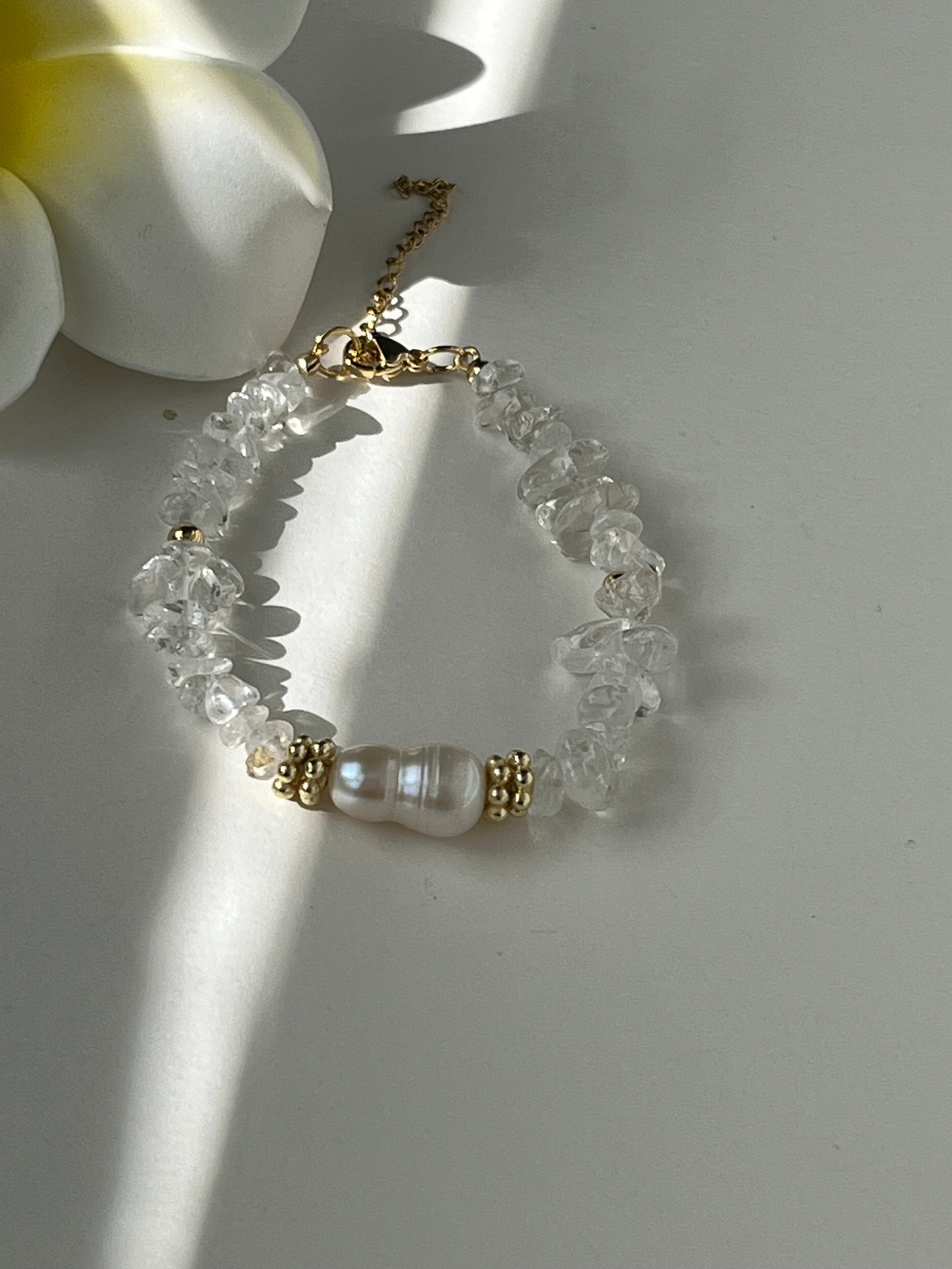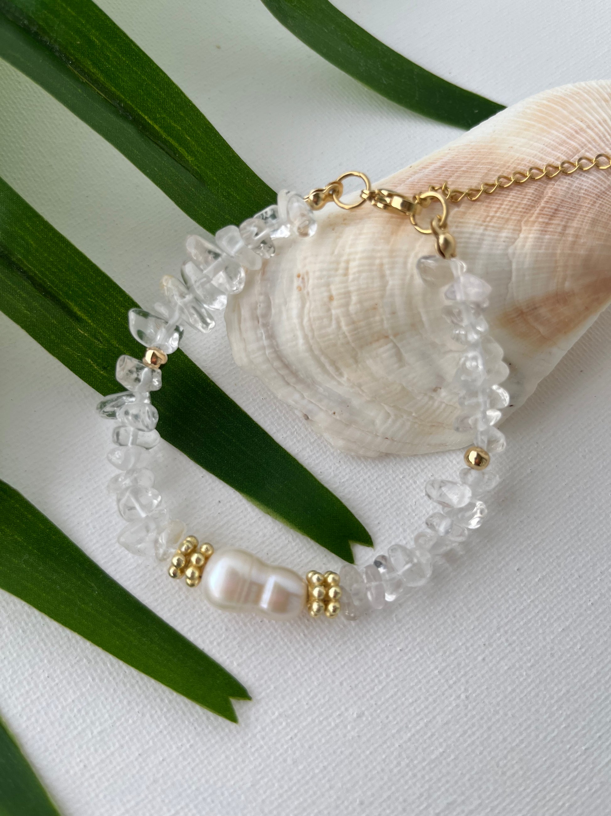 Made of clear quartz, fresh water pearls and gold filled findings. Measures from 6.5-8 inches long. Fits many size wrists.