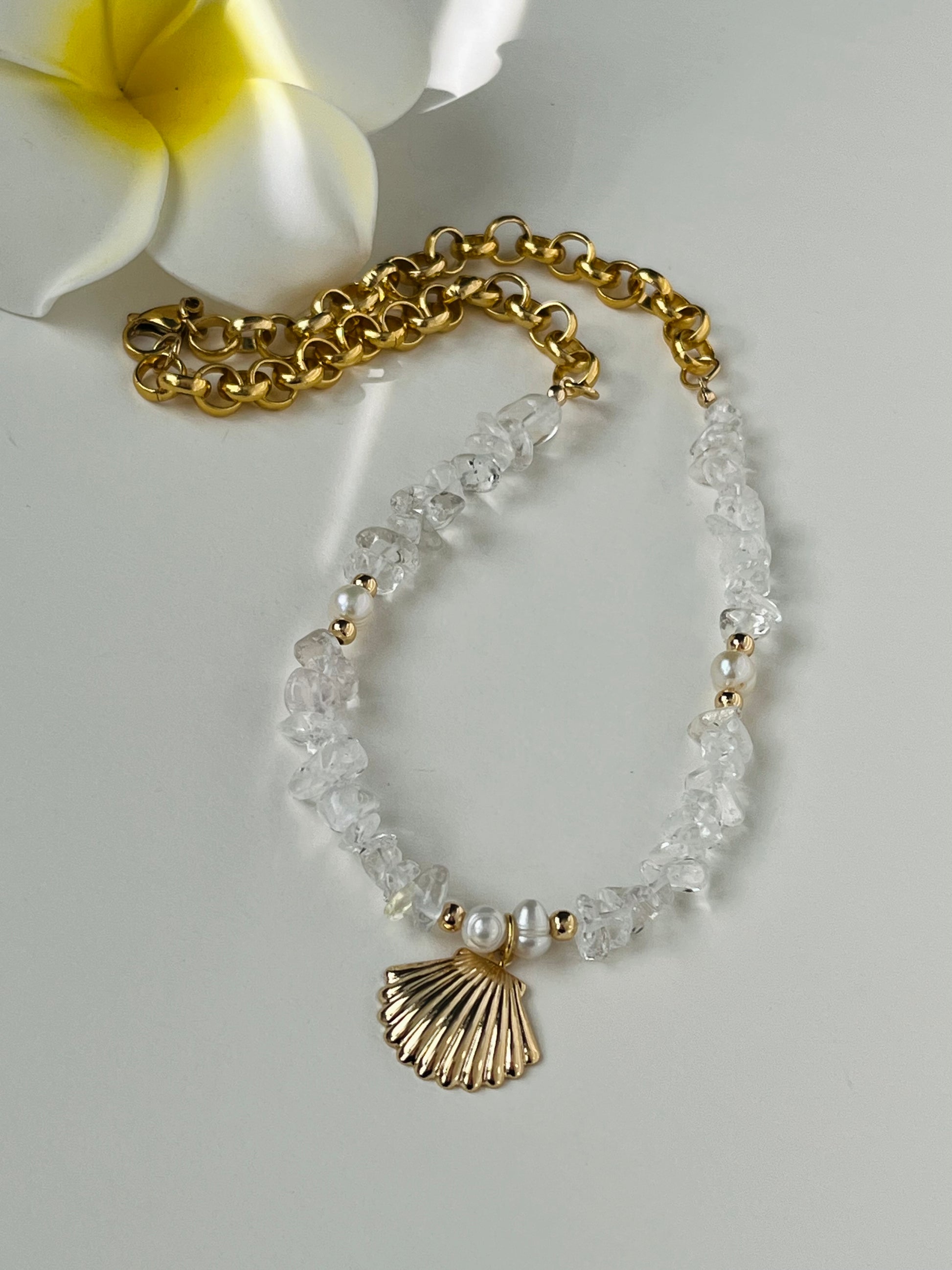 Made of natural clear quartz, fresh water pearls and gold plated beads. The chain is aluminum which won’t tarnish nor change color.