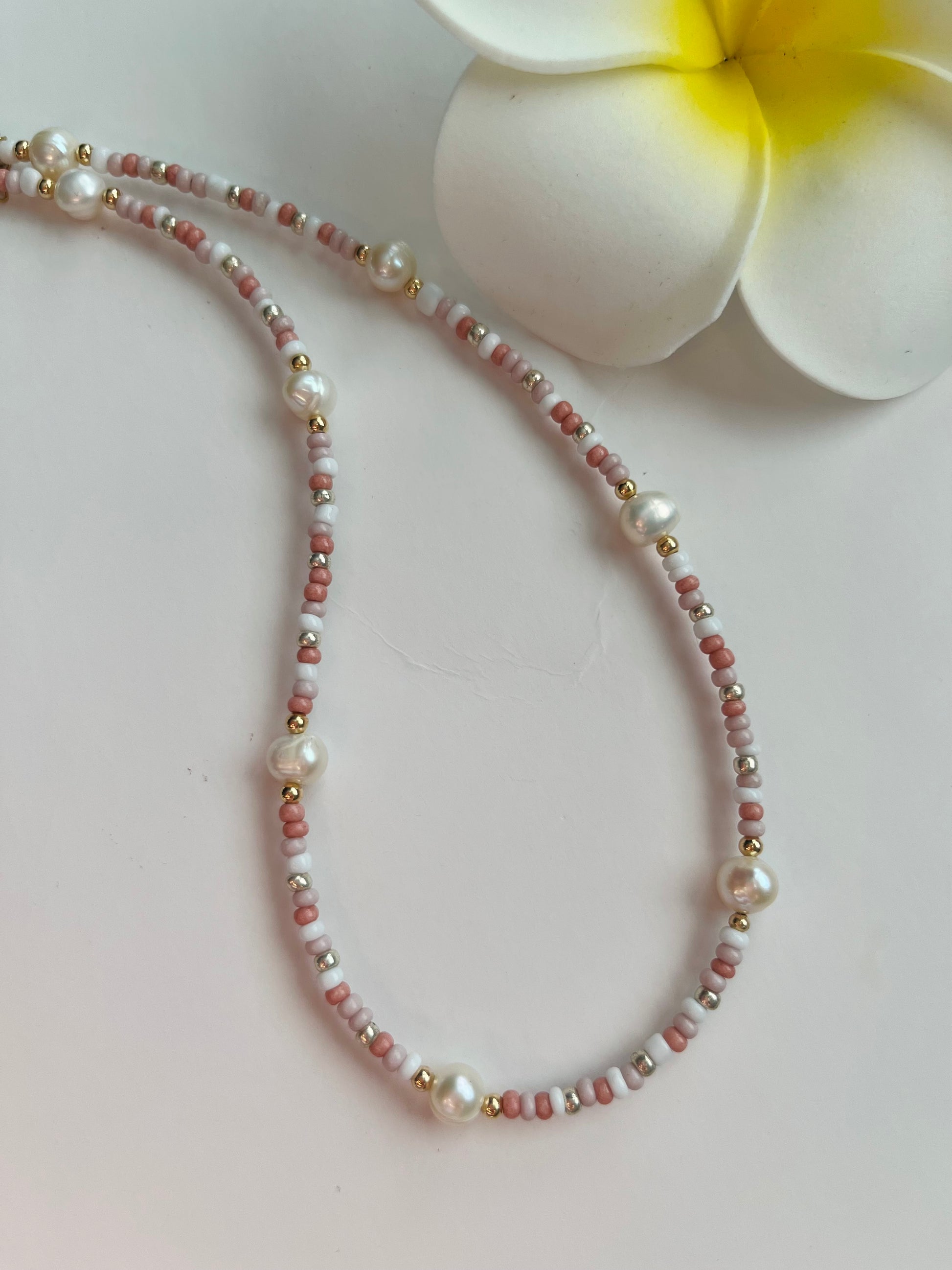 This unique pearl and seed beed necklace is an exquisite combination of pink, white and beige designed and handmade with love. Perfect for any occasion. This striking piece adds an elegante touch to any outfit. Start your day feeling beautiful and gorgeous with this beautiful necklace.