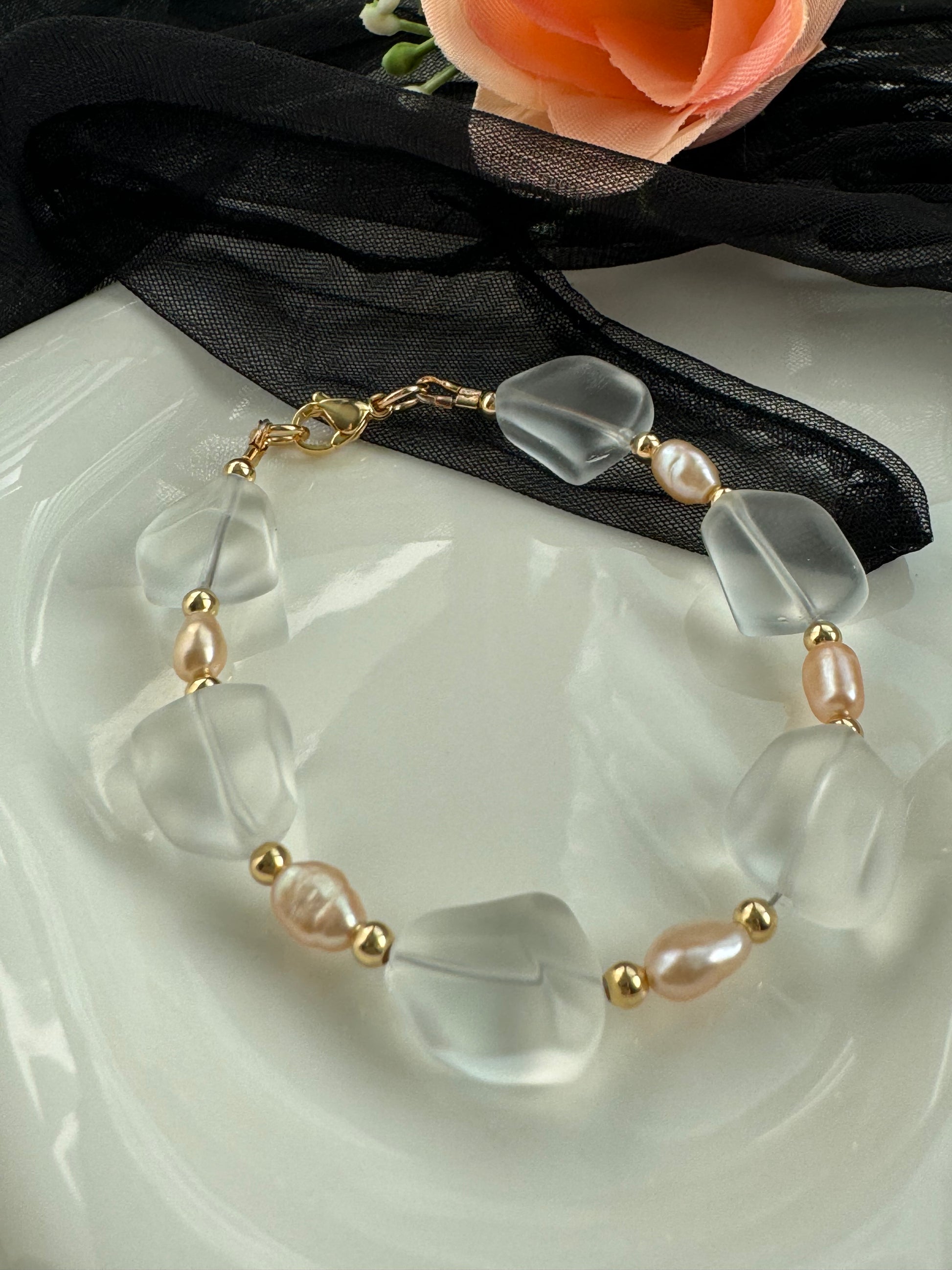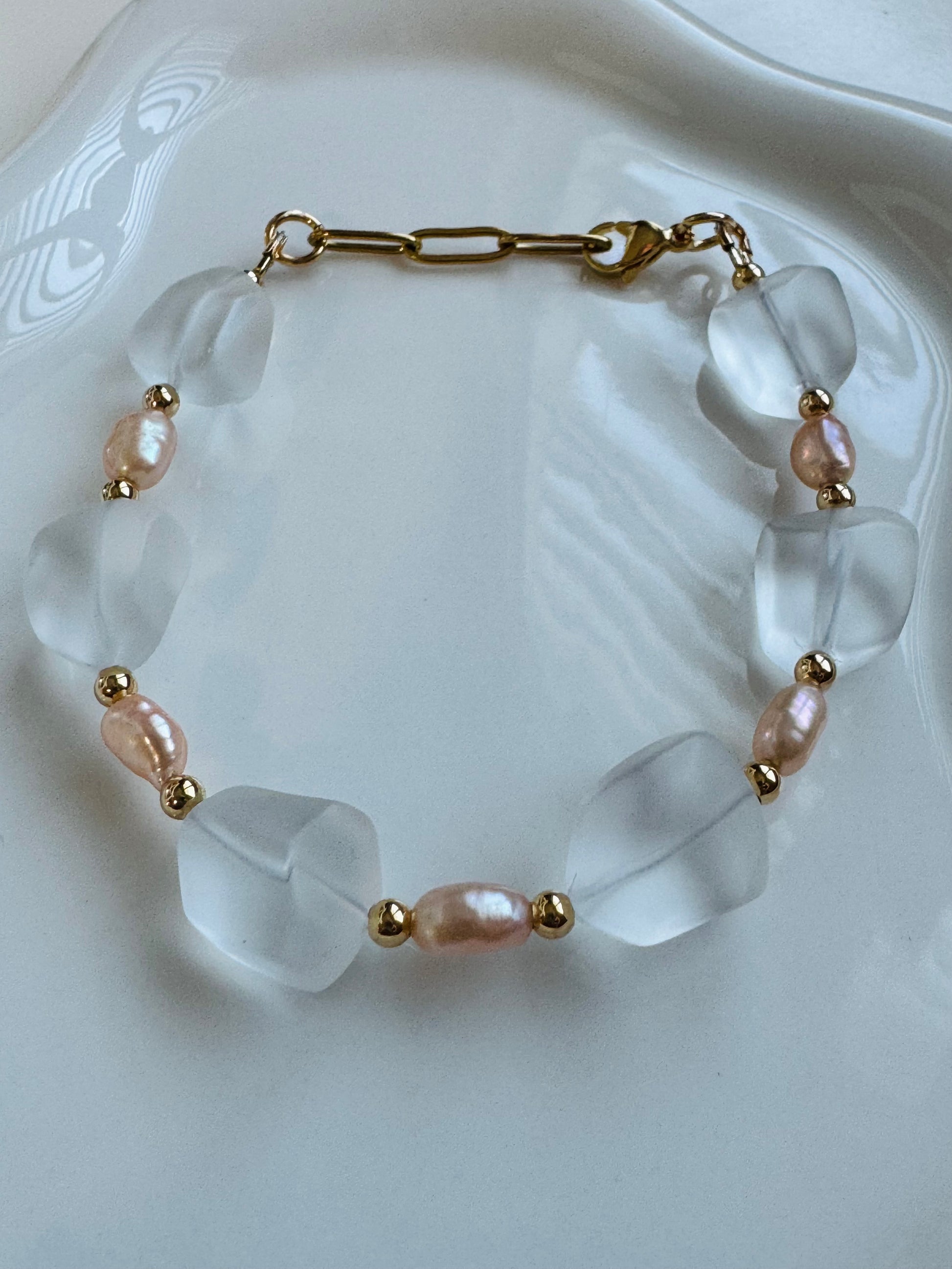 Made of recycle glass and rose natural pearls and gold filled findings. Measures 7 inches plus extension