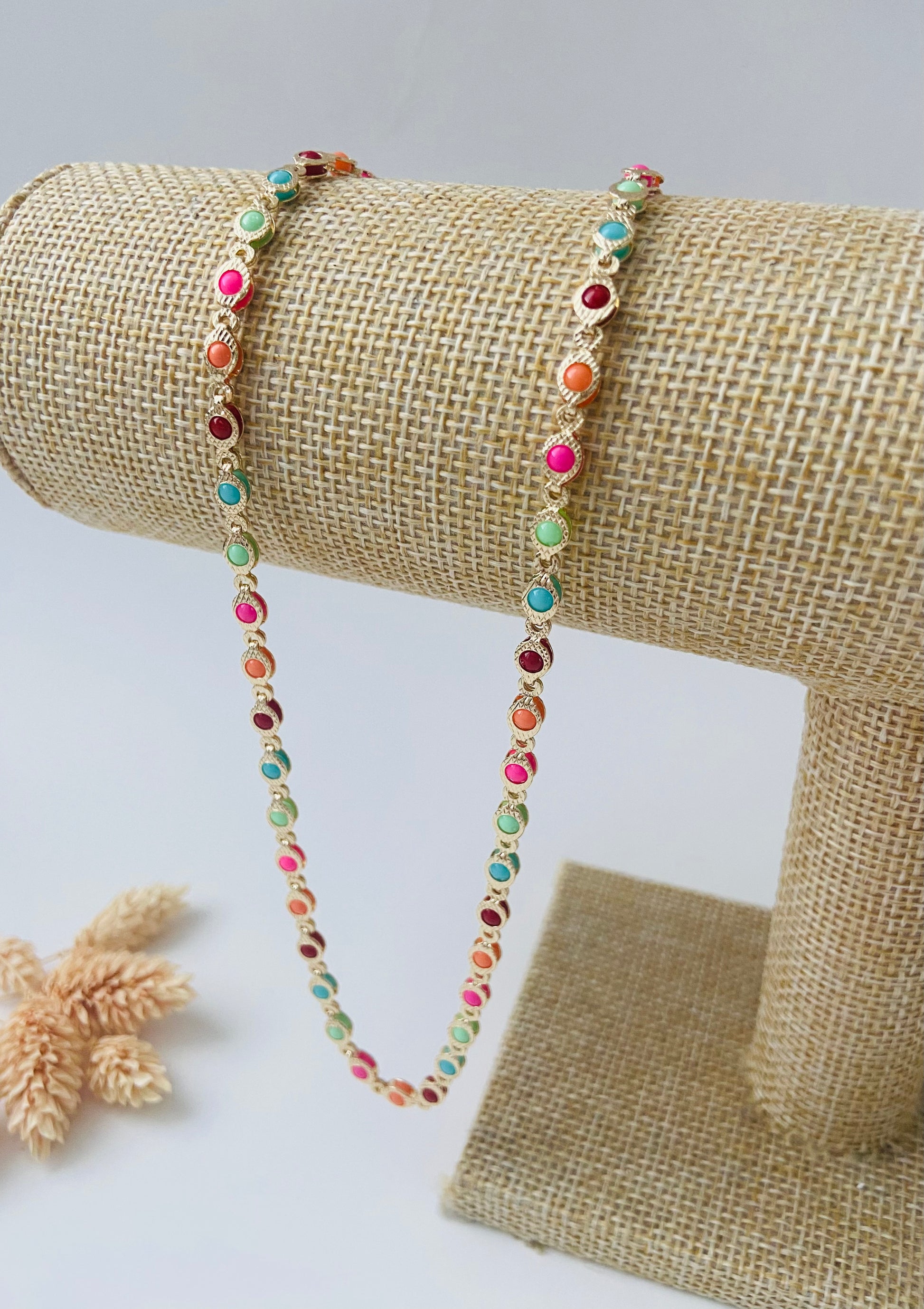 Gold filled measures 17 inches long. Great for layering with other chains. Gives a pop of color to your outfit. Excellent quality.