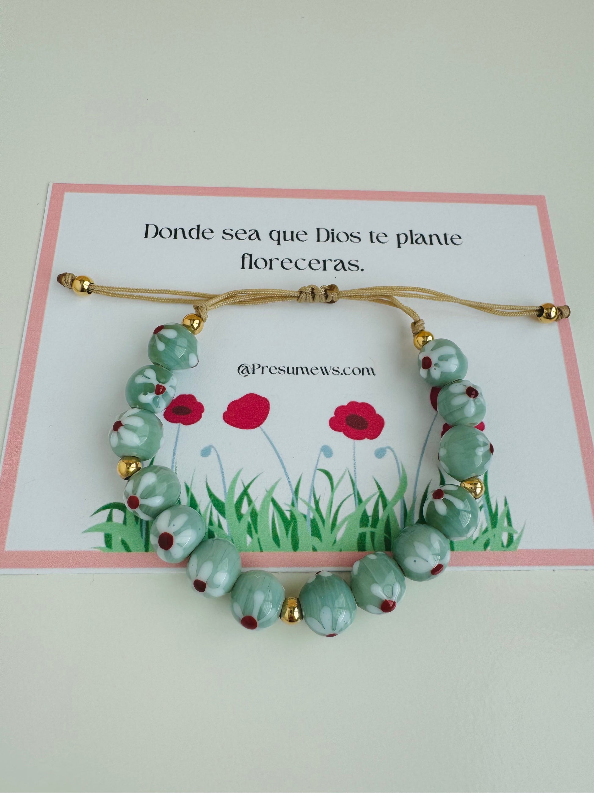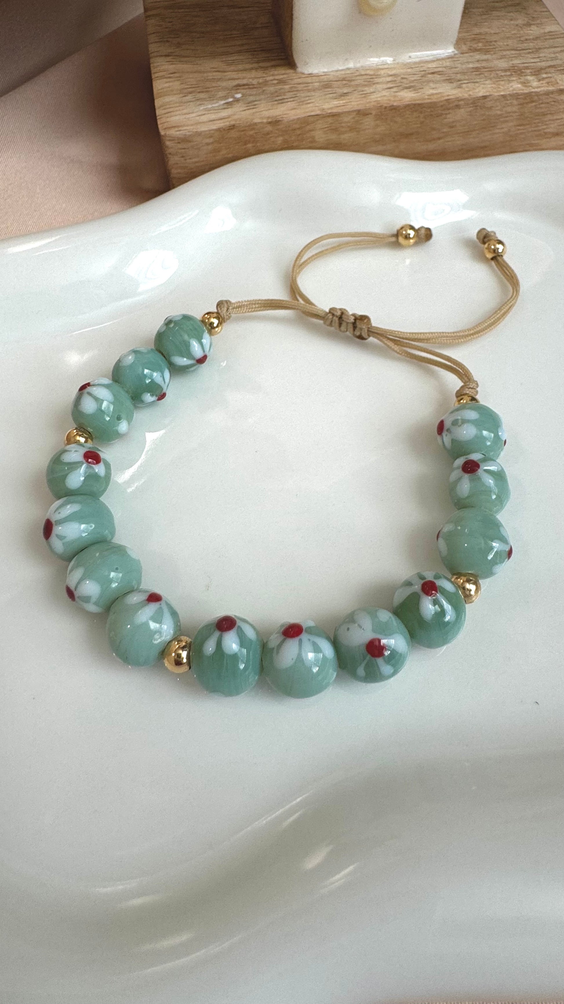 Lamp work beads with gold plated beads. Ajustable fits many size wrist.
