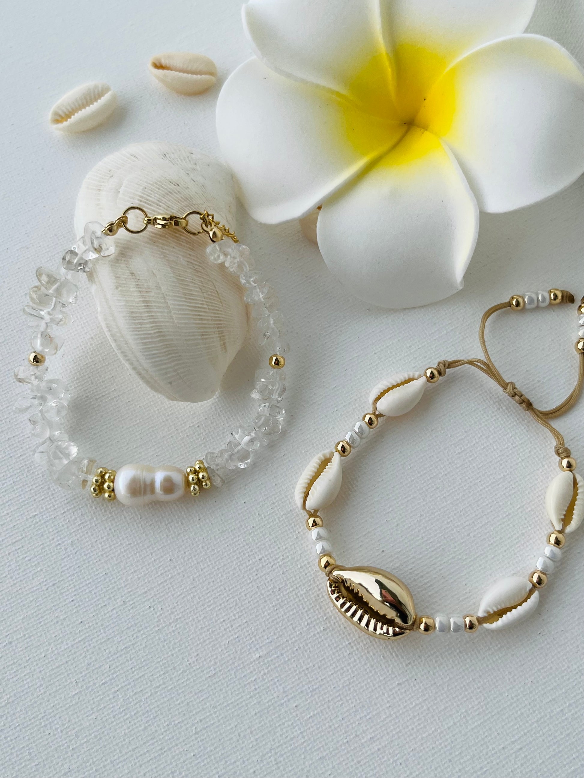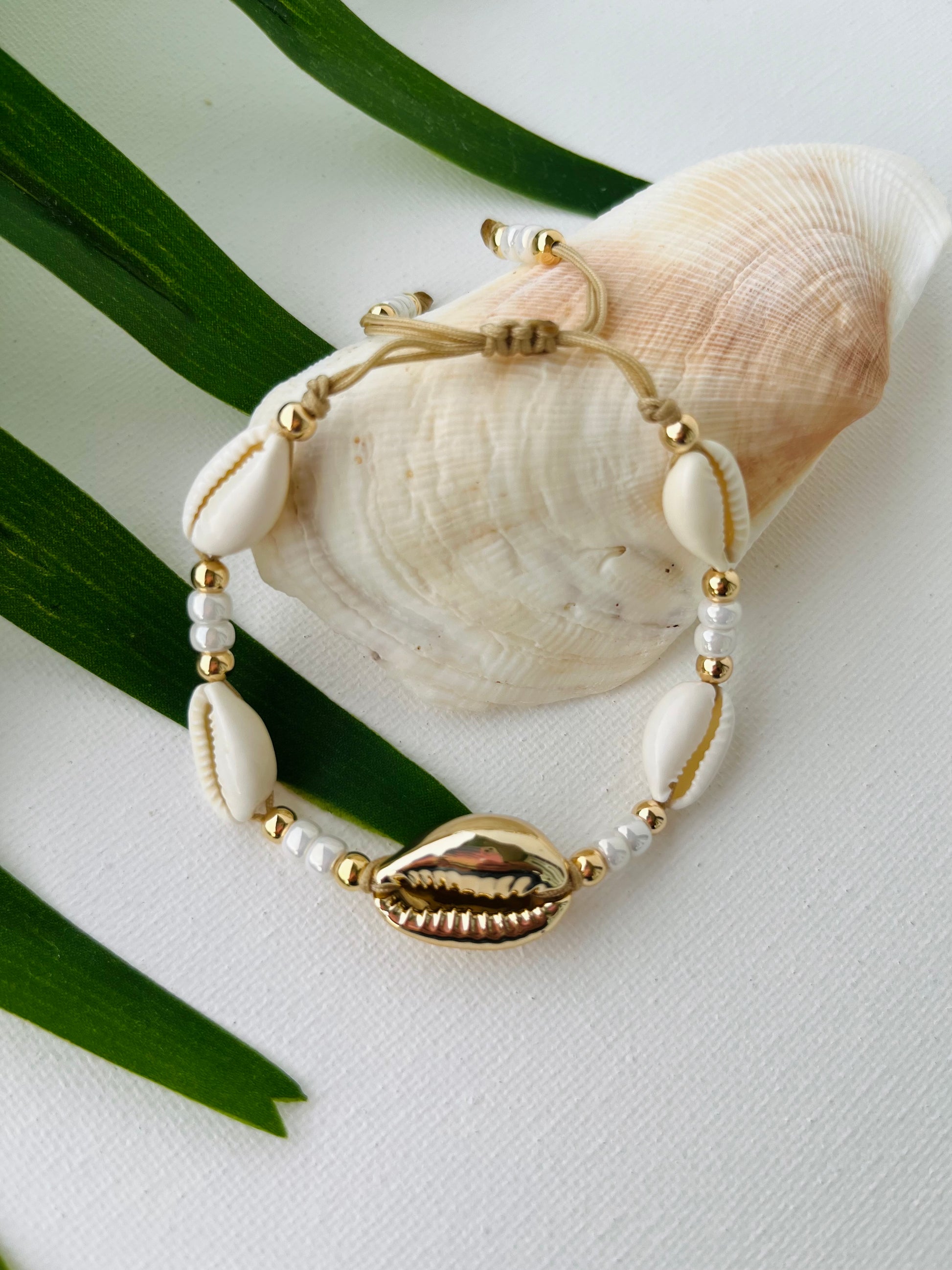 Ajustable handmade bracelet made of Cowie Shell, white sead beads and gold plated beads. Fits all size wrist.