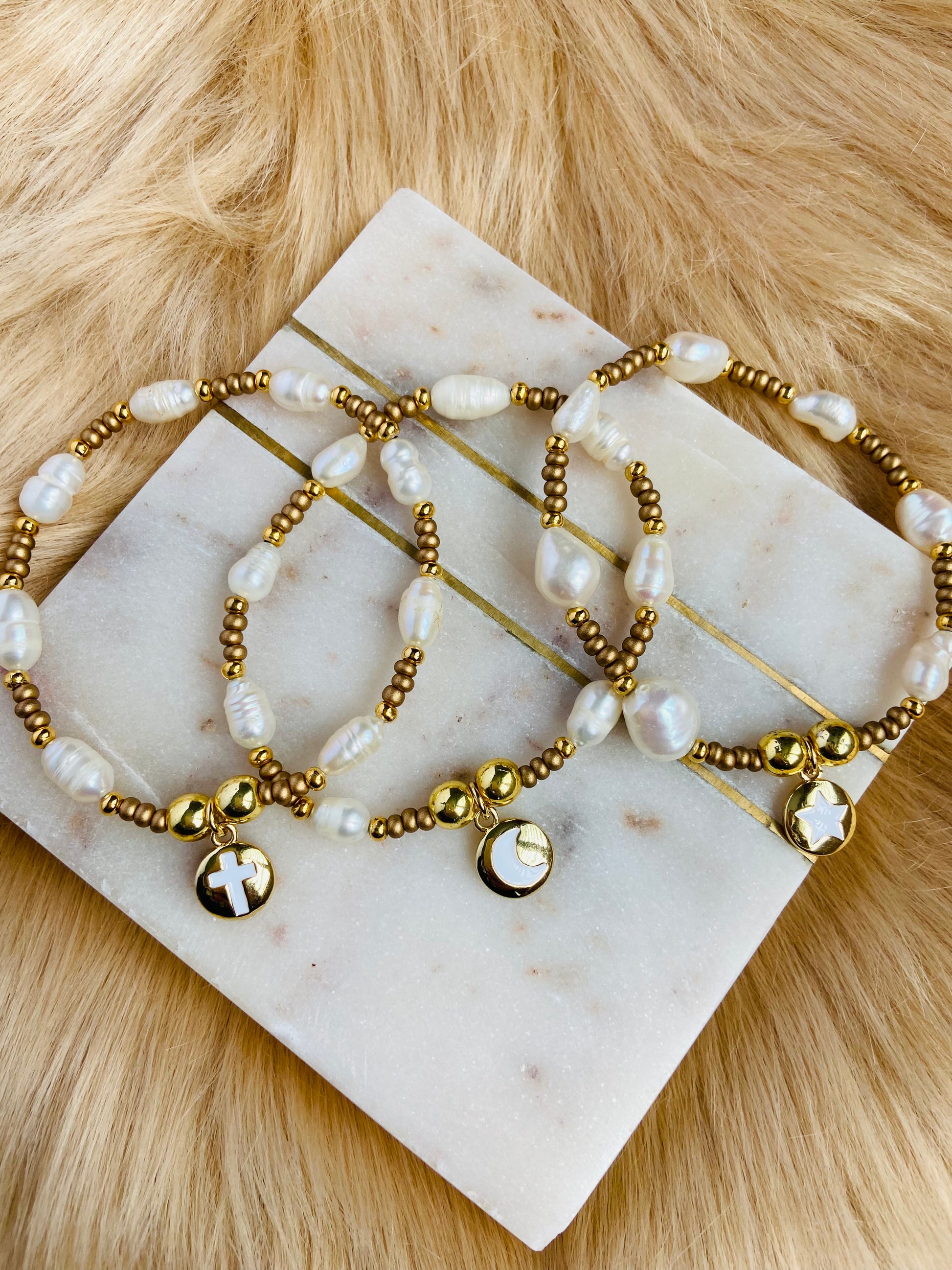 Elastic band bracelet made of fresh water pearls 14k gold plated beads and seed beads. Charm is goldfilled.