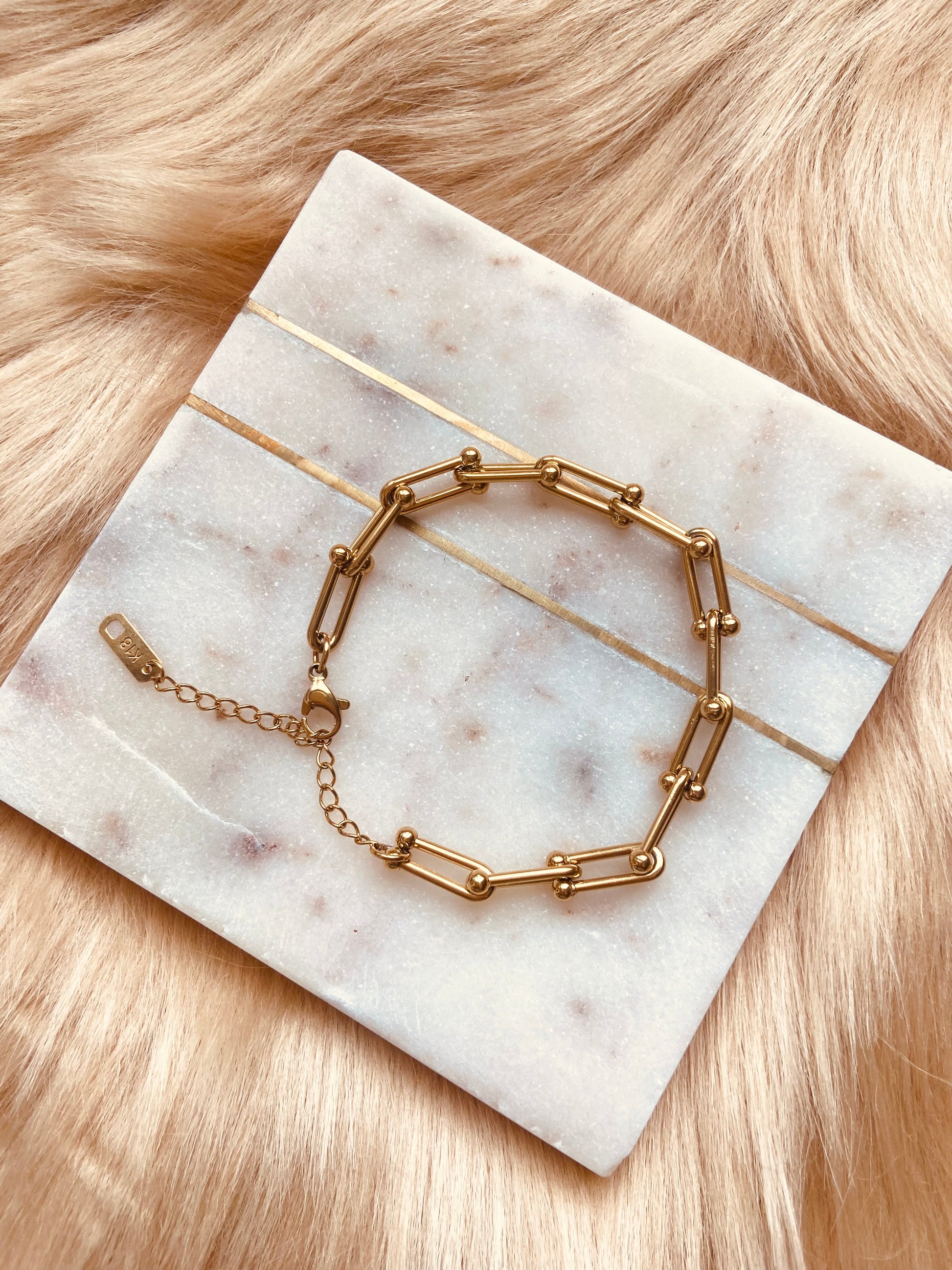 Stainless steel with a 14k gold plated coat. Measures 6-8 inches long. Tarnish free