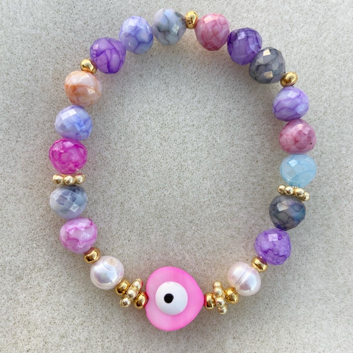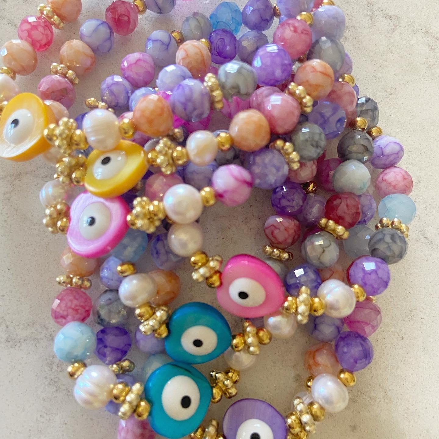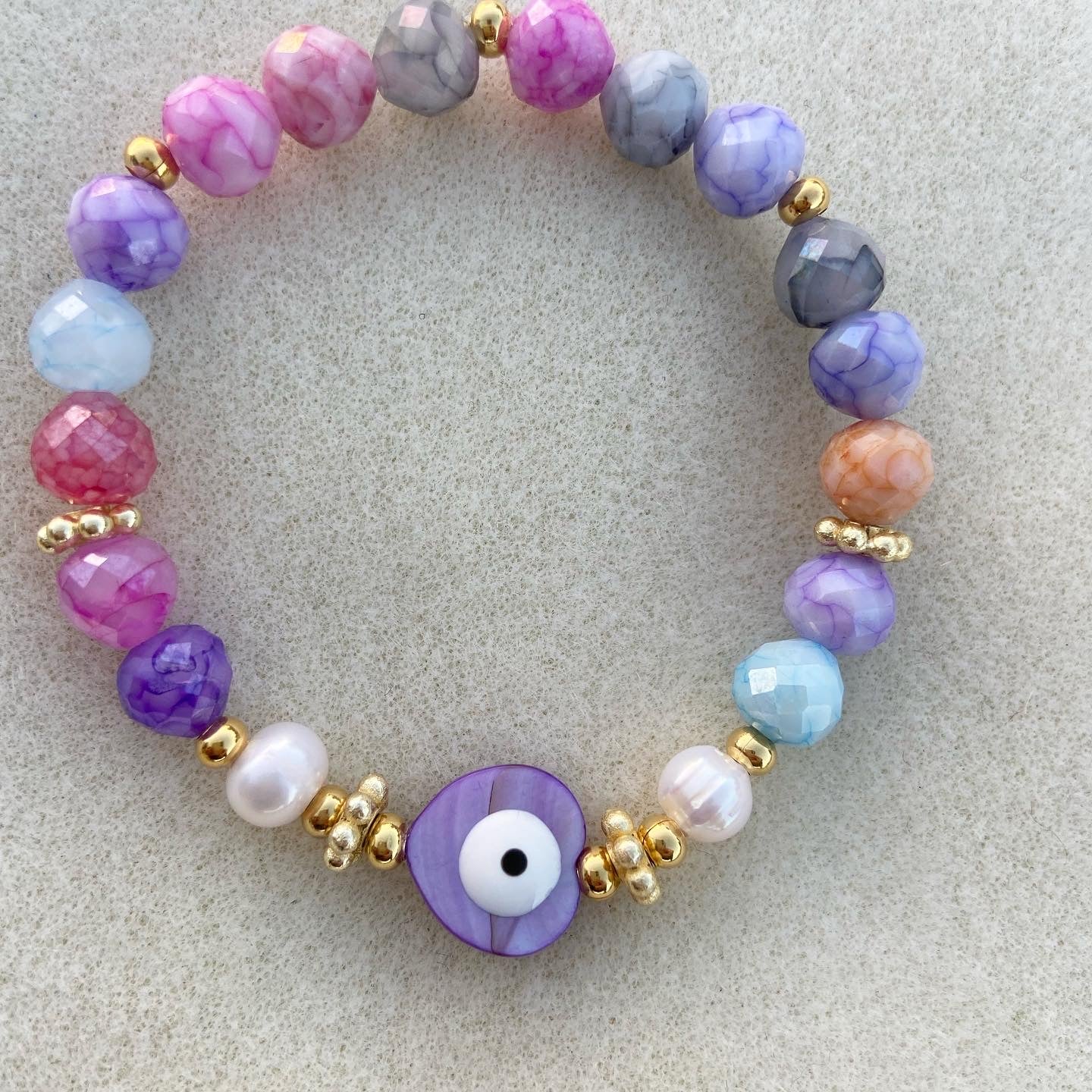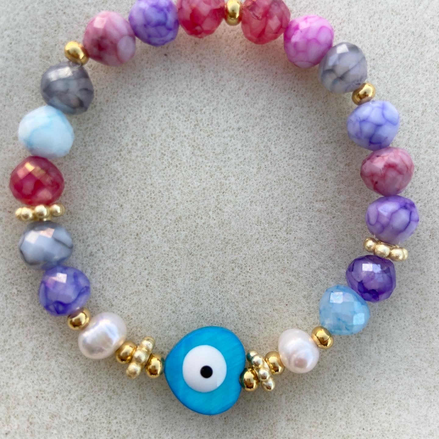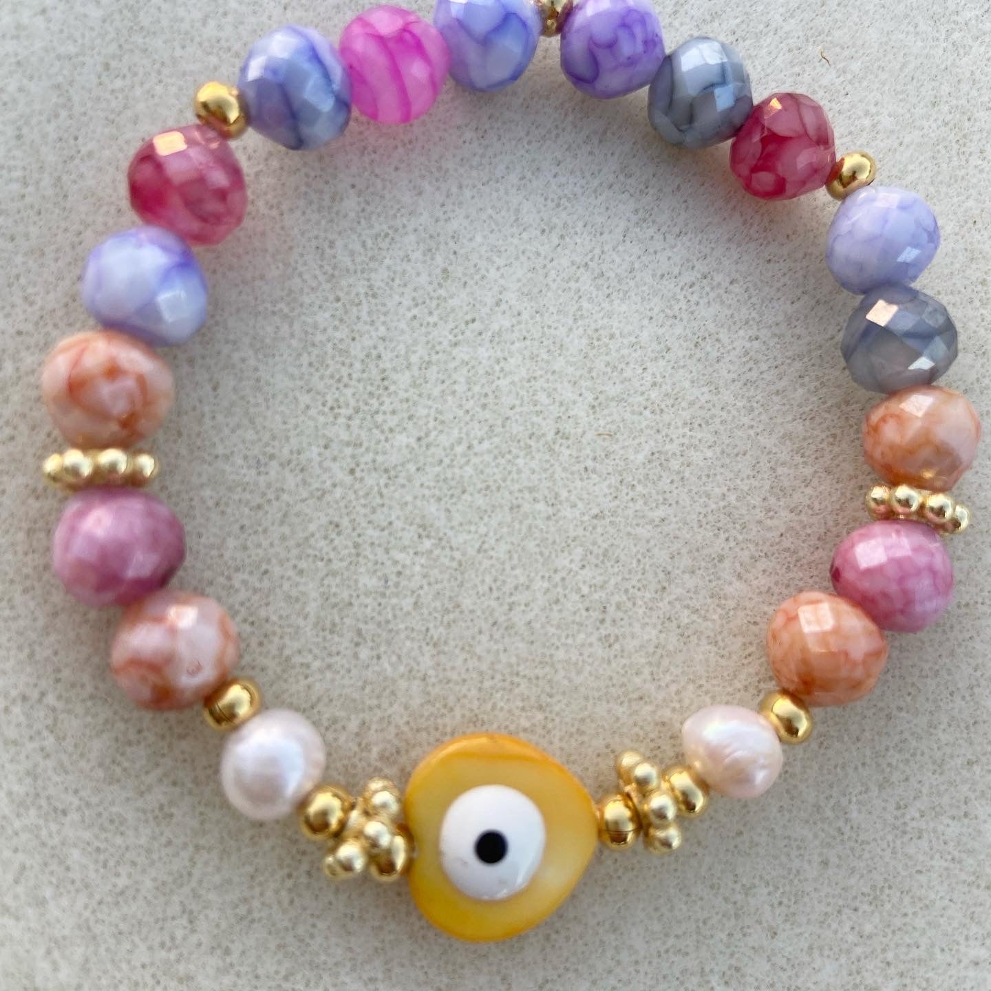 Natural stone, fresh water pearls, goldfilled beads. Nacar evil eye heart. Elastic bracelet