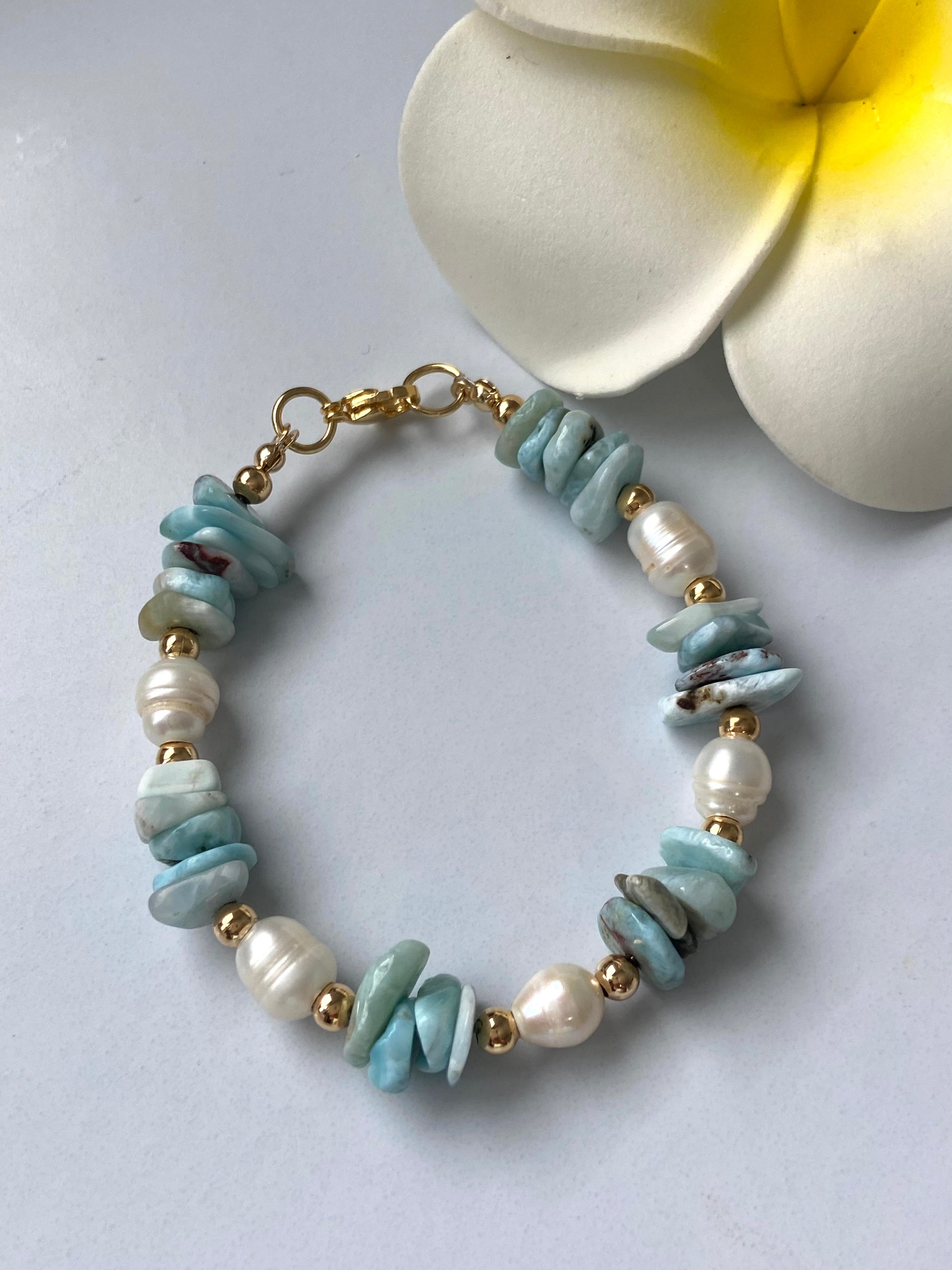 Made of larimar and fresh water pearls. Measures 6 inches long plus extension.