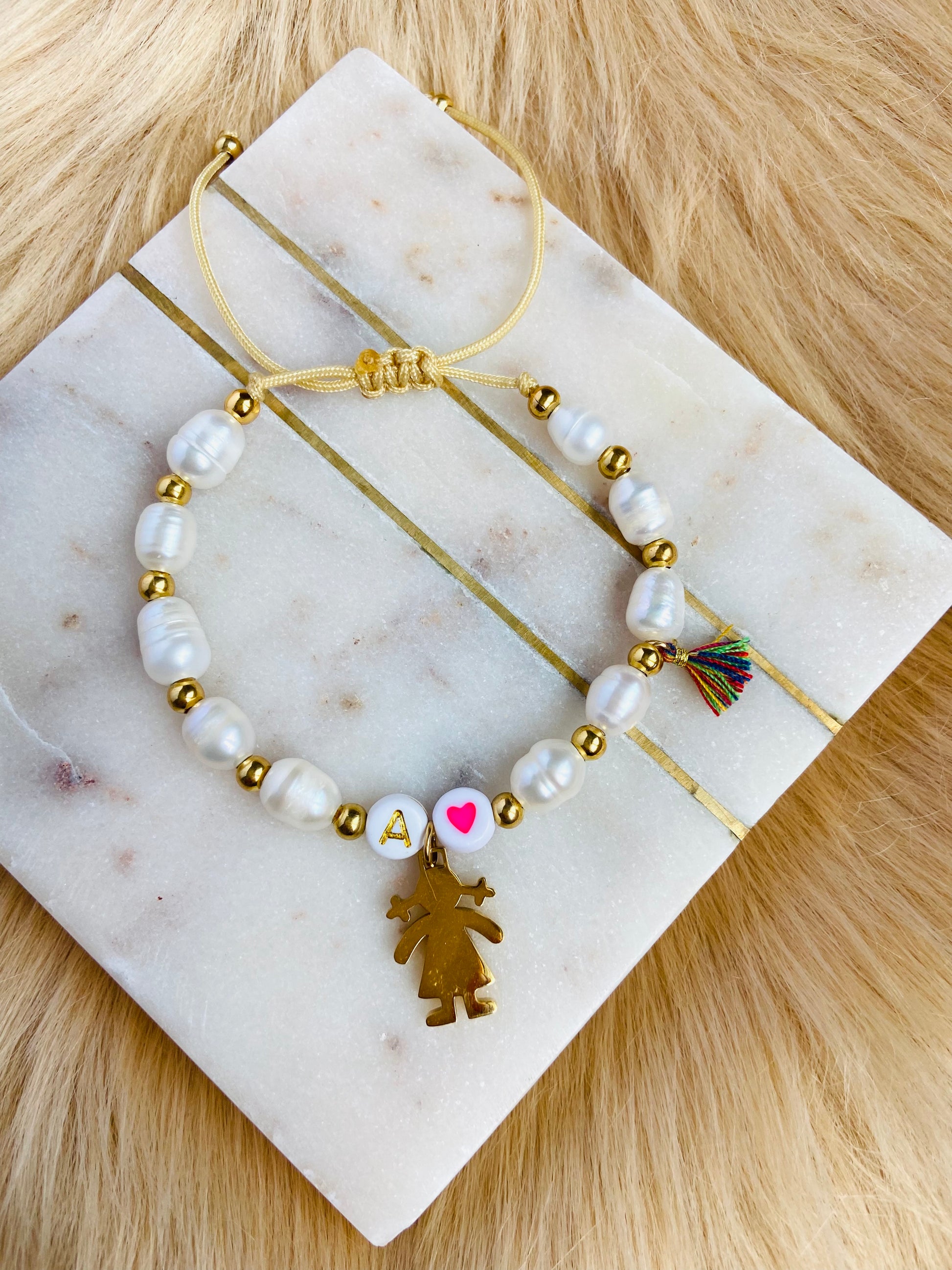 Ajustable bracelet made of fresh water pearls, 14k gold plated beads and stainless steel little girl charm. Fits any wrist size.
