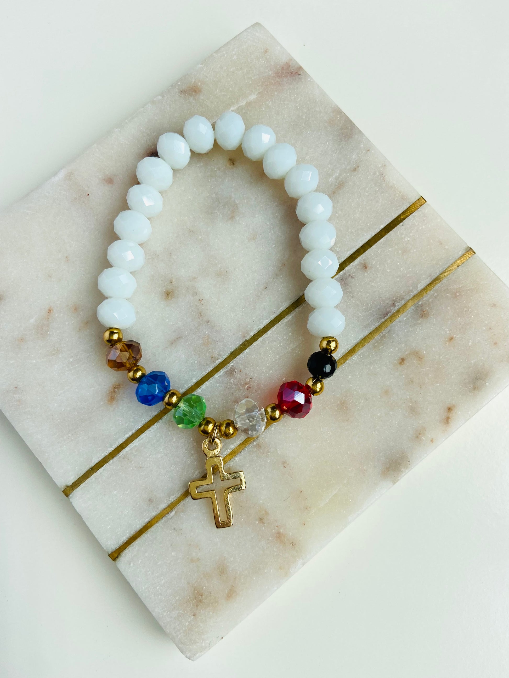 Crystal beads and 14k gold plated beads. Elastic band bracelet, cross charm is gold plated.