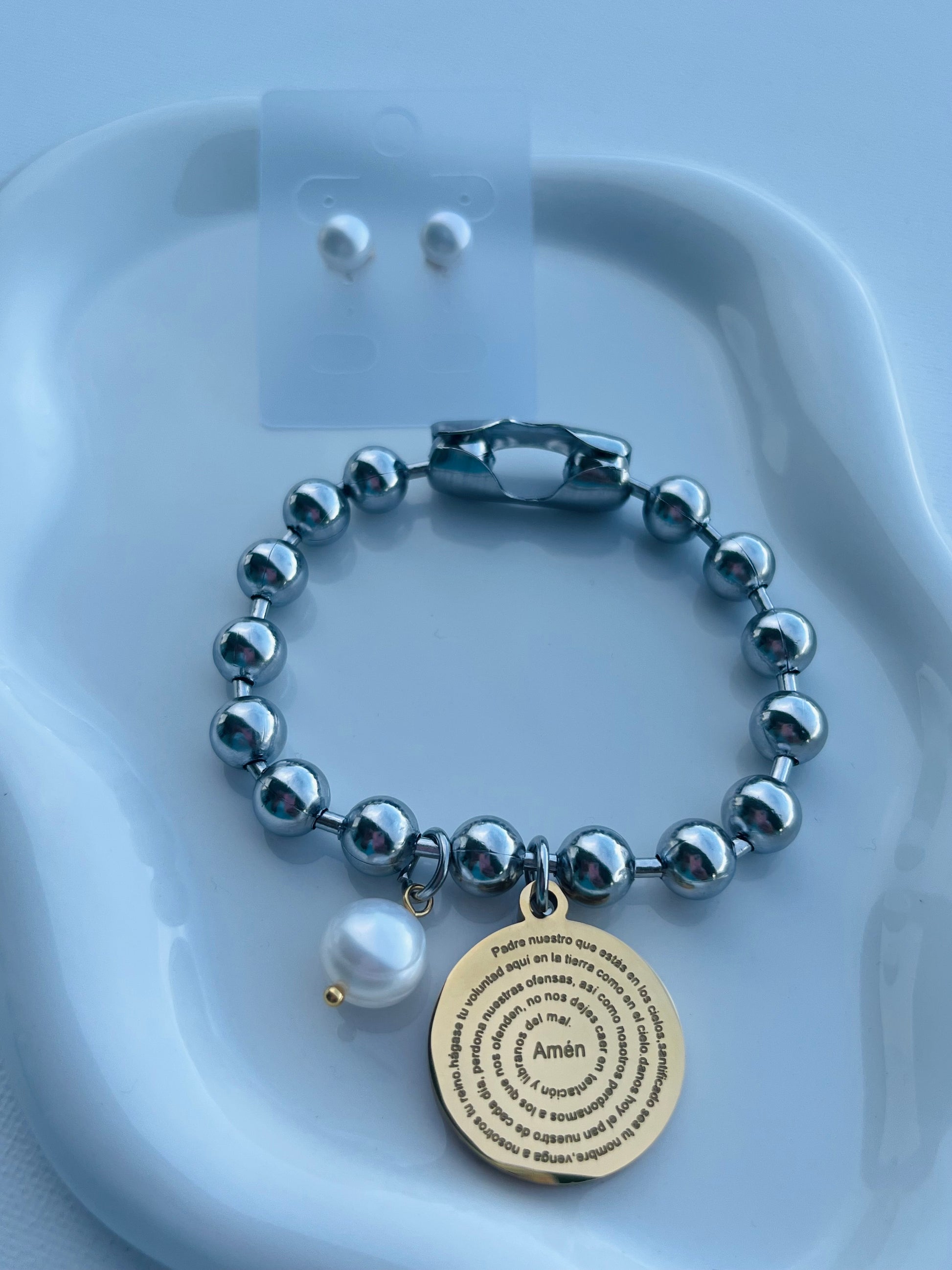 Stainless steel military ball bracelet with fresh water pearl. Includes pearl stud earrings.