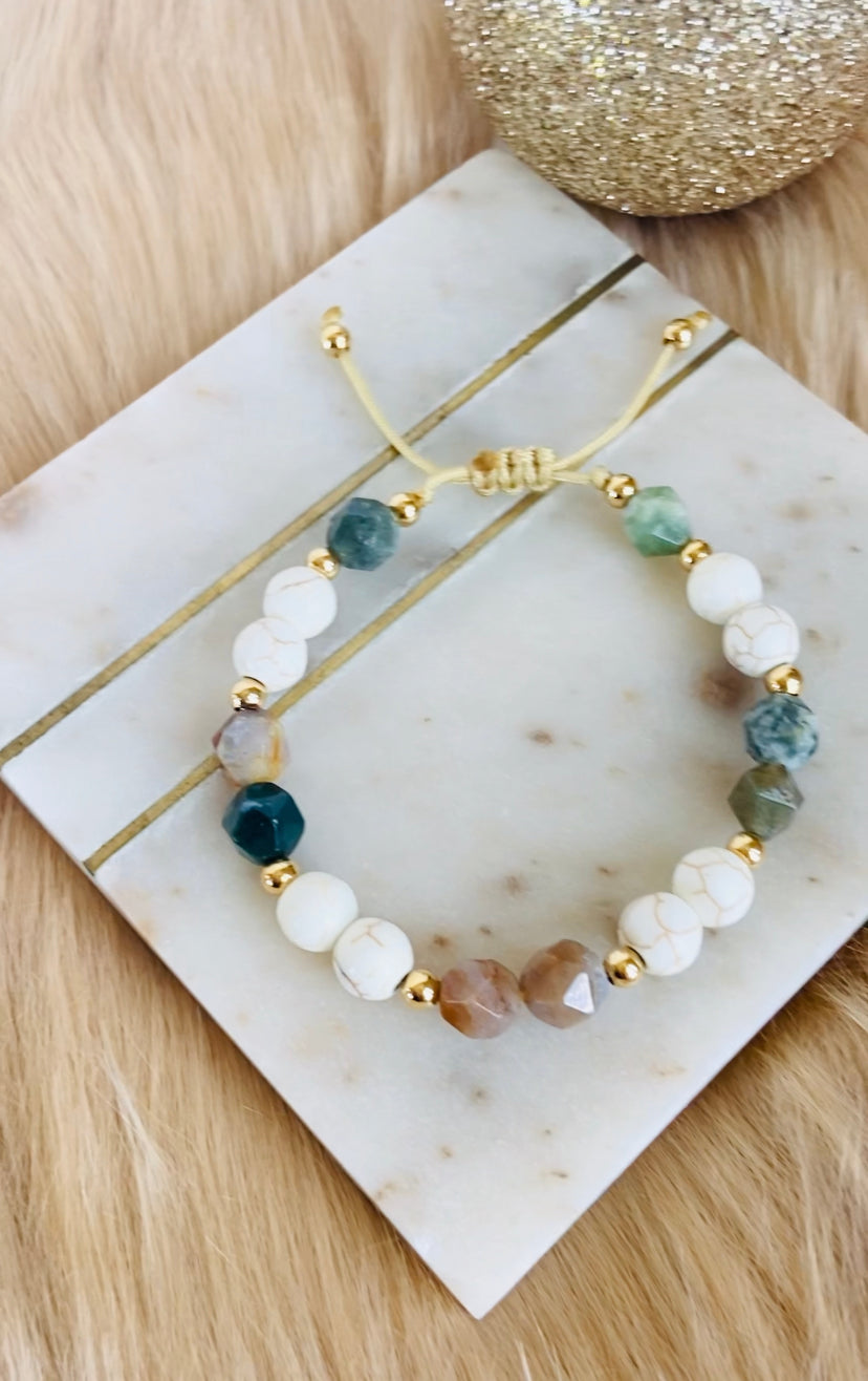 Ajustable bracelet fits many size wrists. Agatas beads, turquoise beads and gold plated beads.