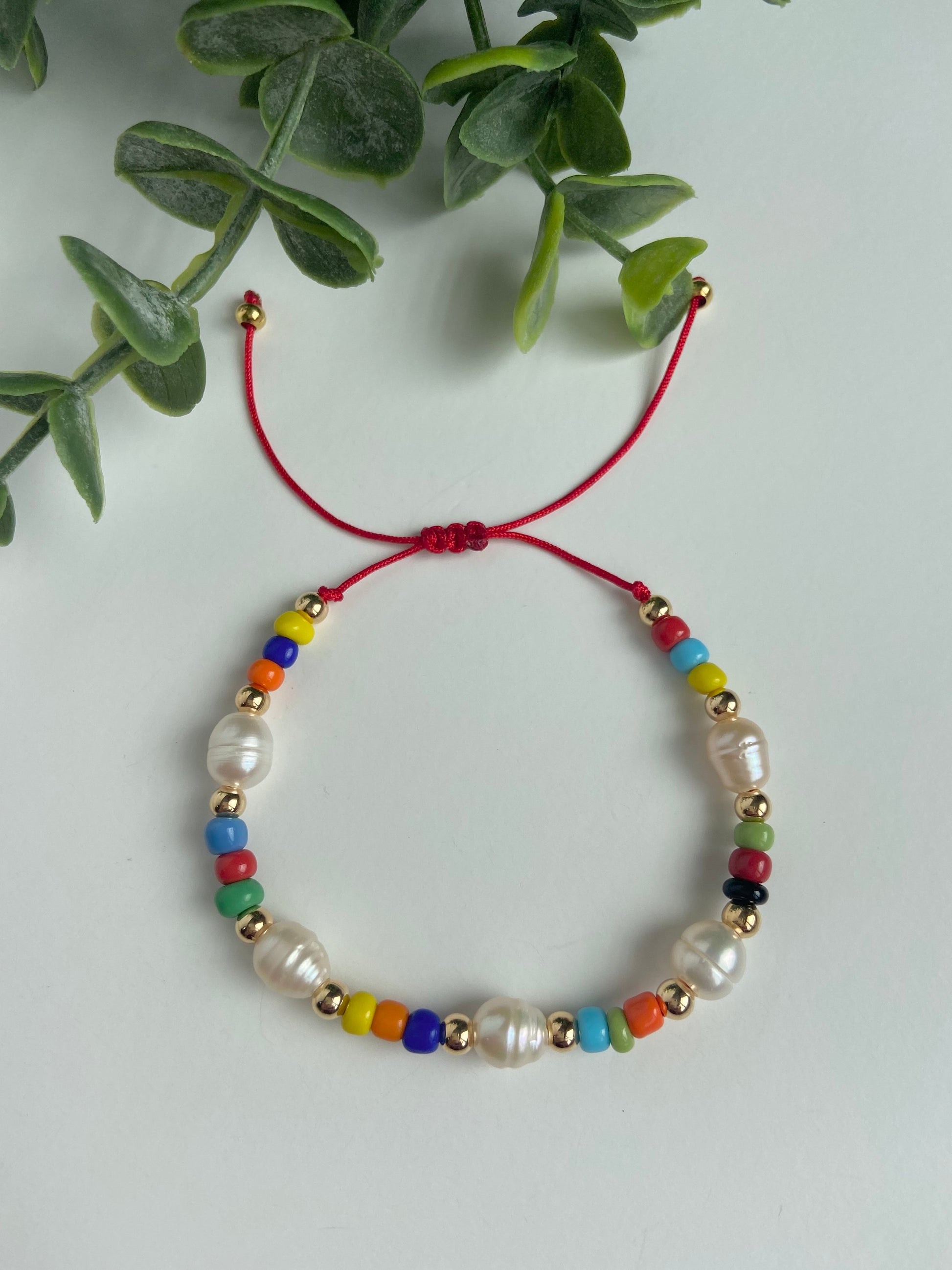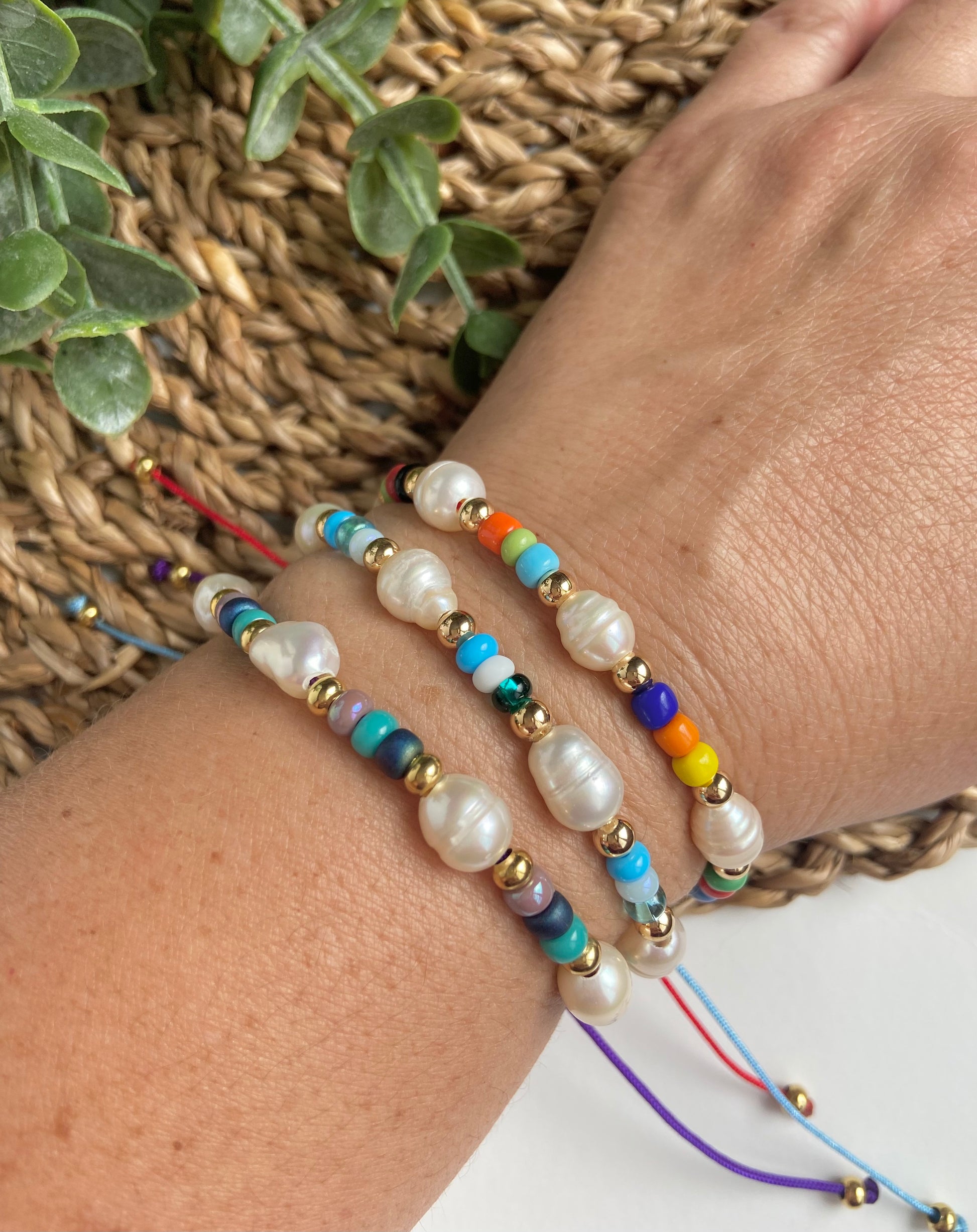 Ajustable, made of seed bead and fresh water pearl with gold plated beads