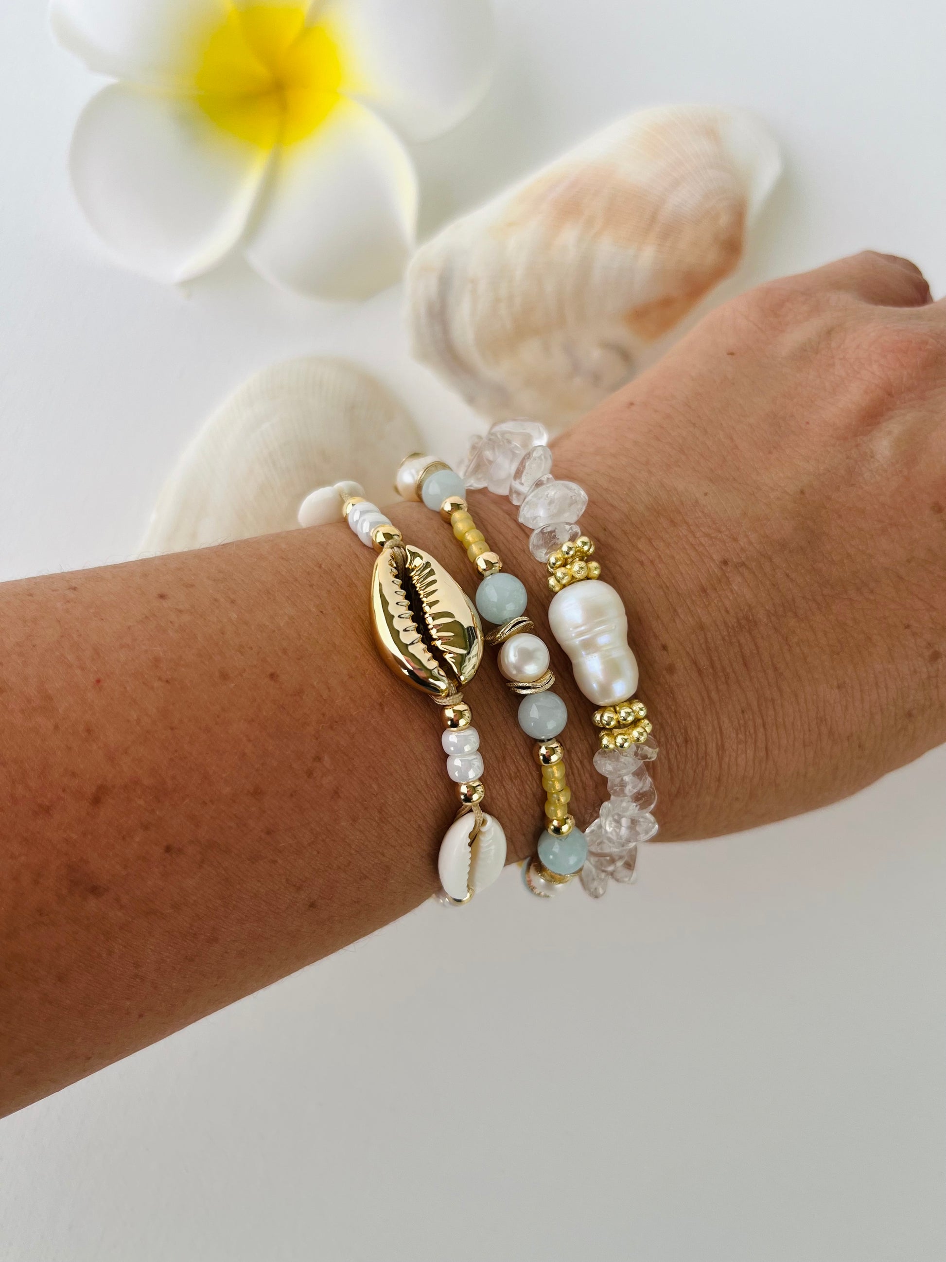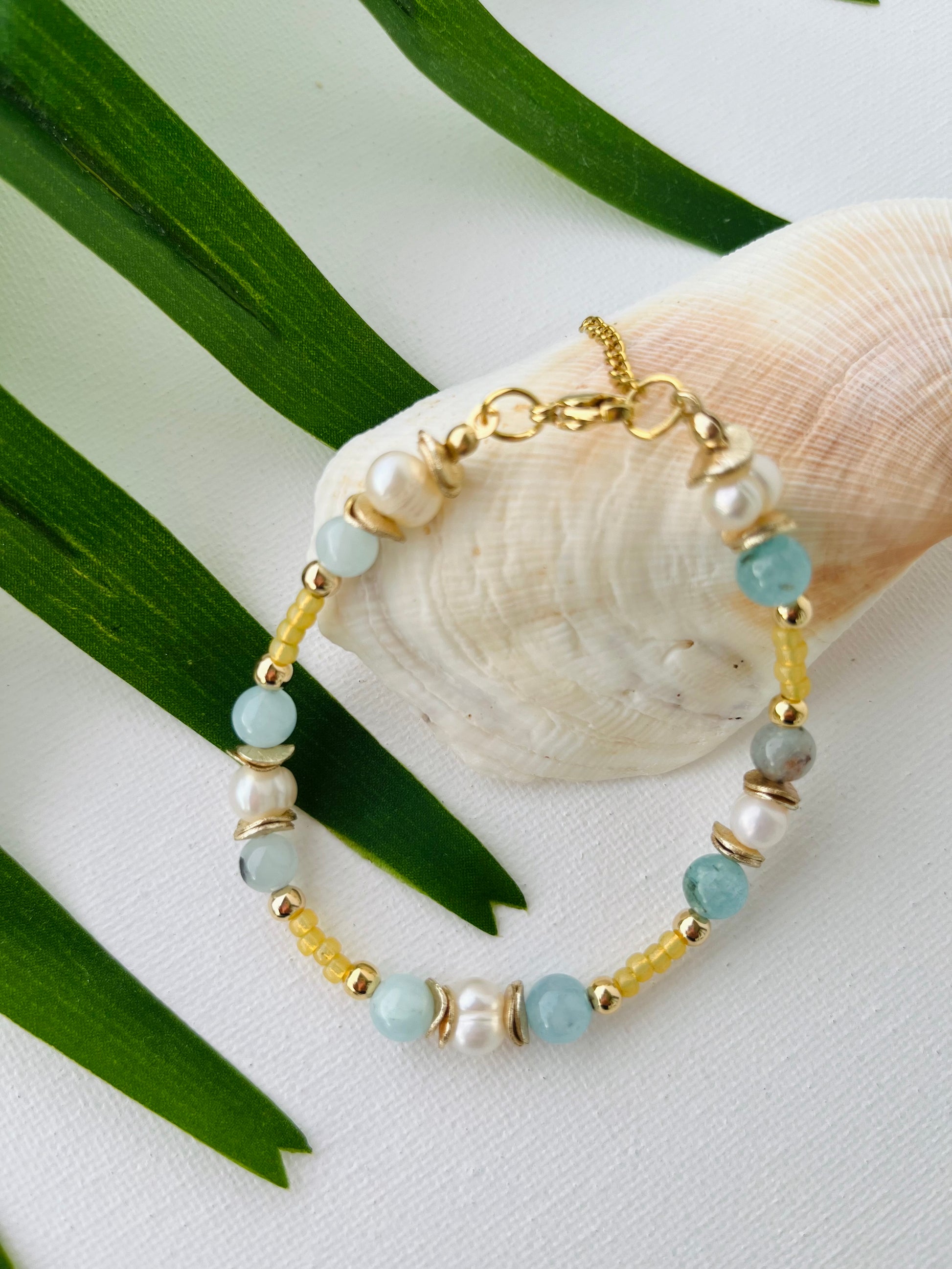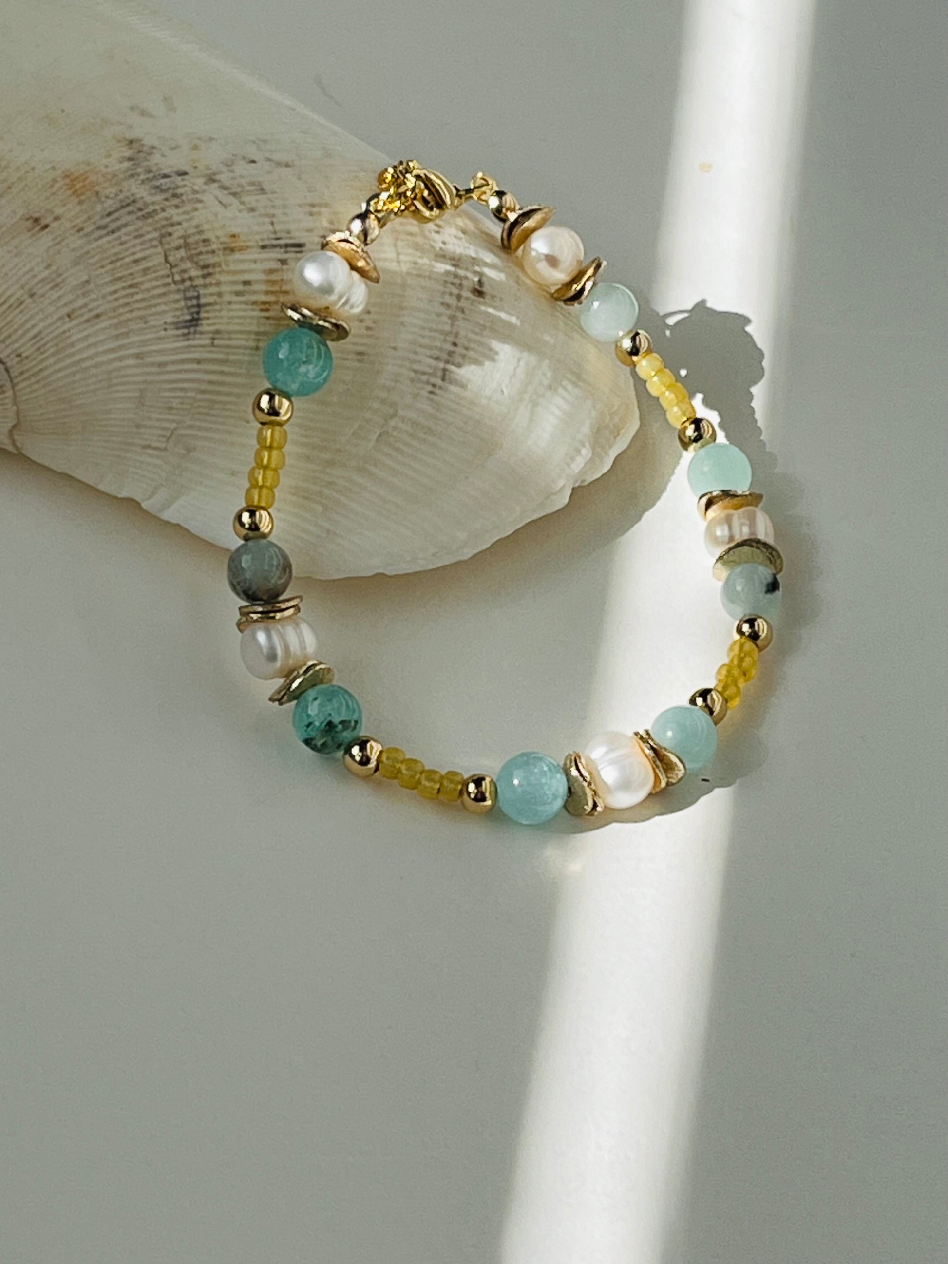 Bracelet made of Jade stone, fresh water pearls, seed beads and gold plated beads. Measures 7inches long.
