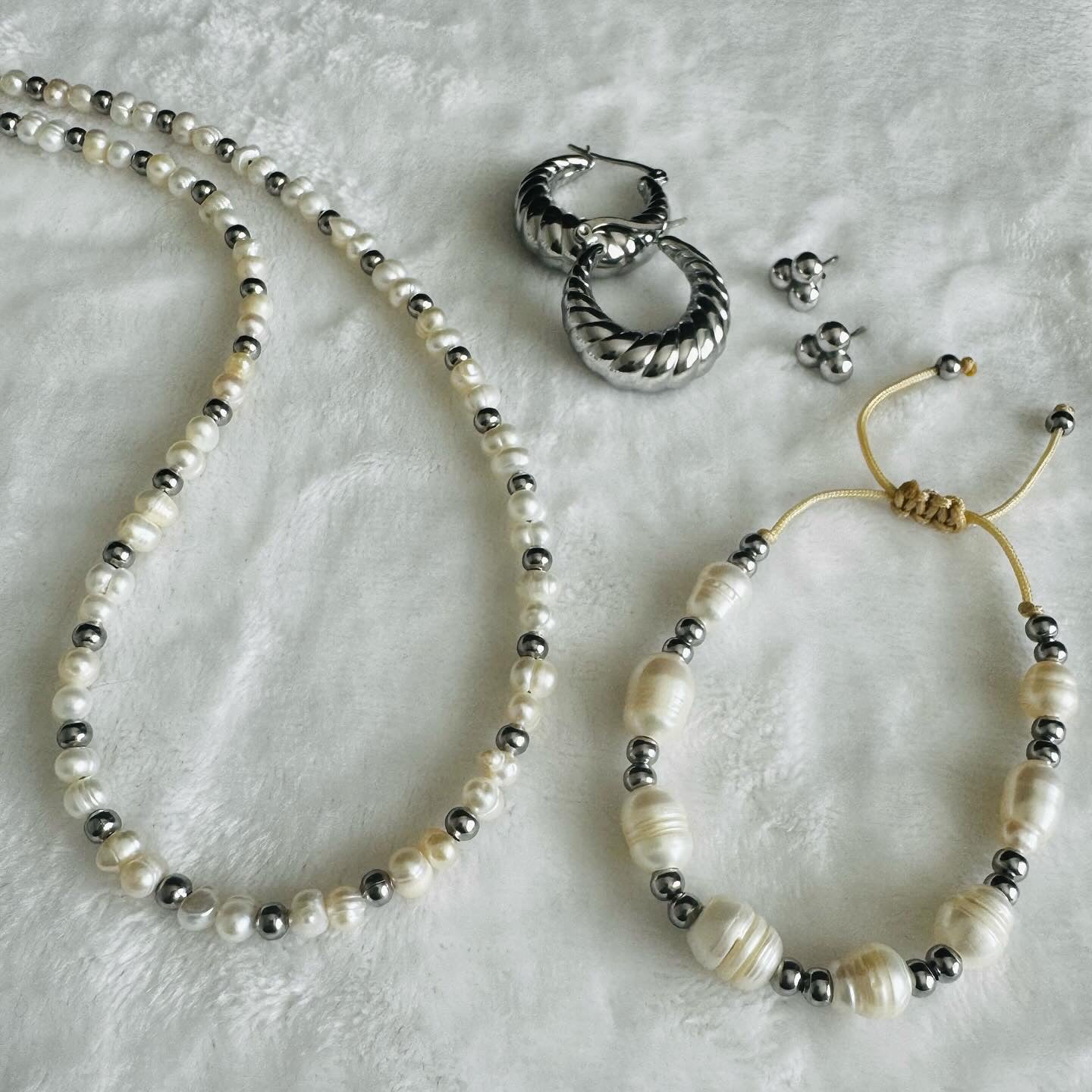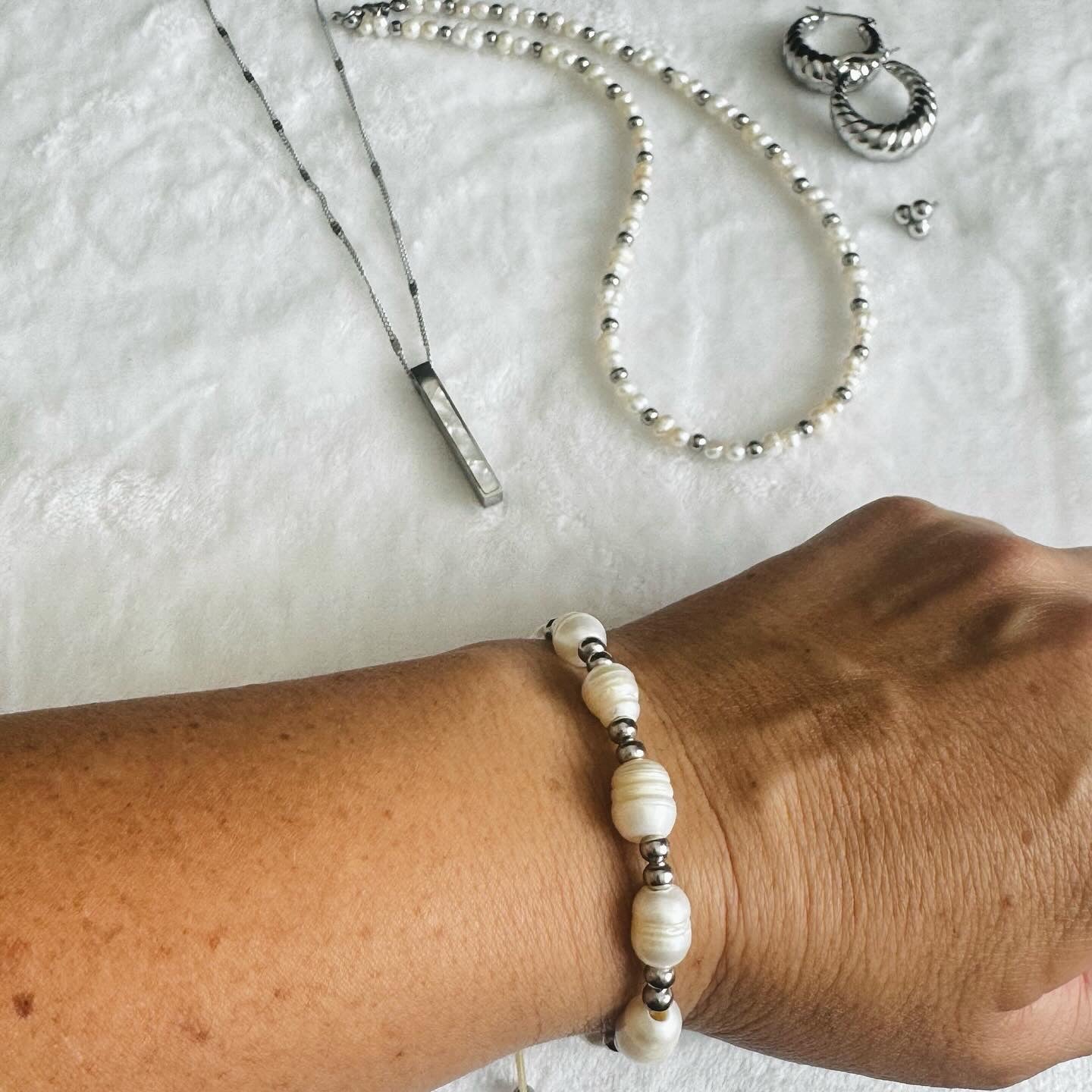 Ajustable bracelet made with fresh water pearls and stainless steel beads. Fits any wrist size.