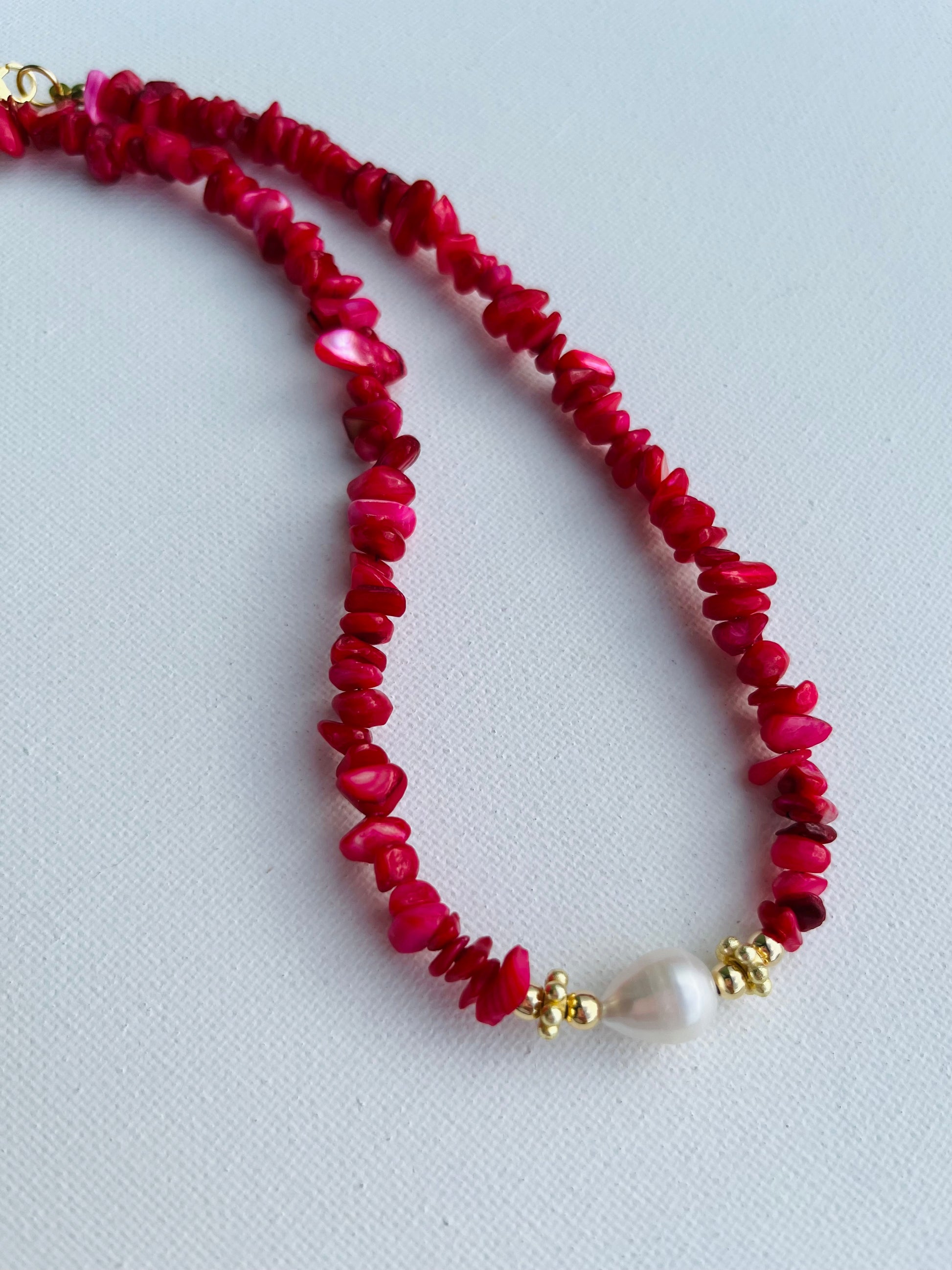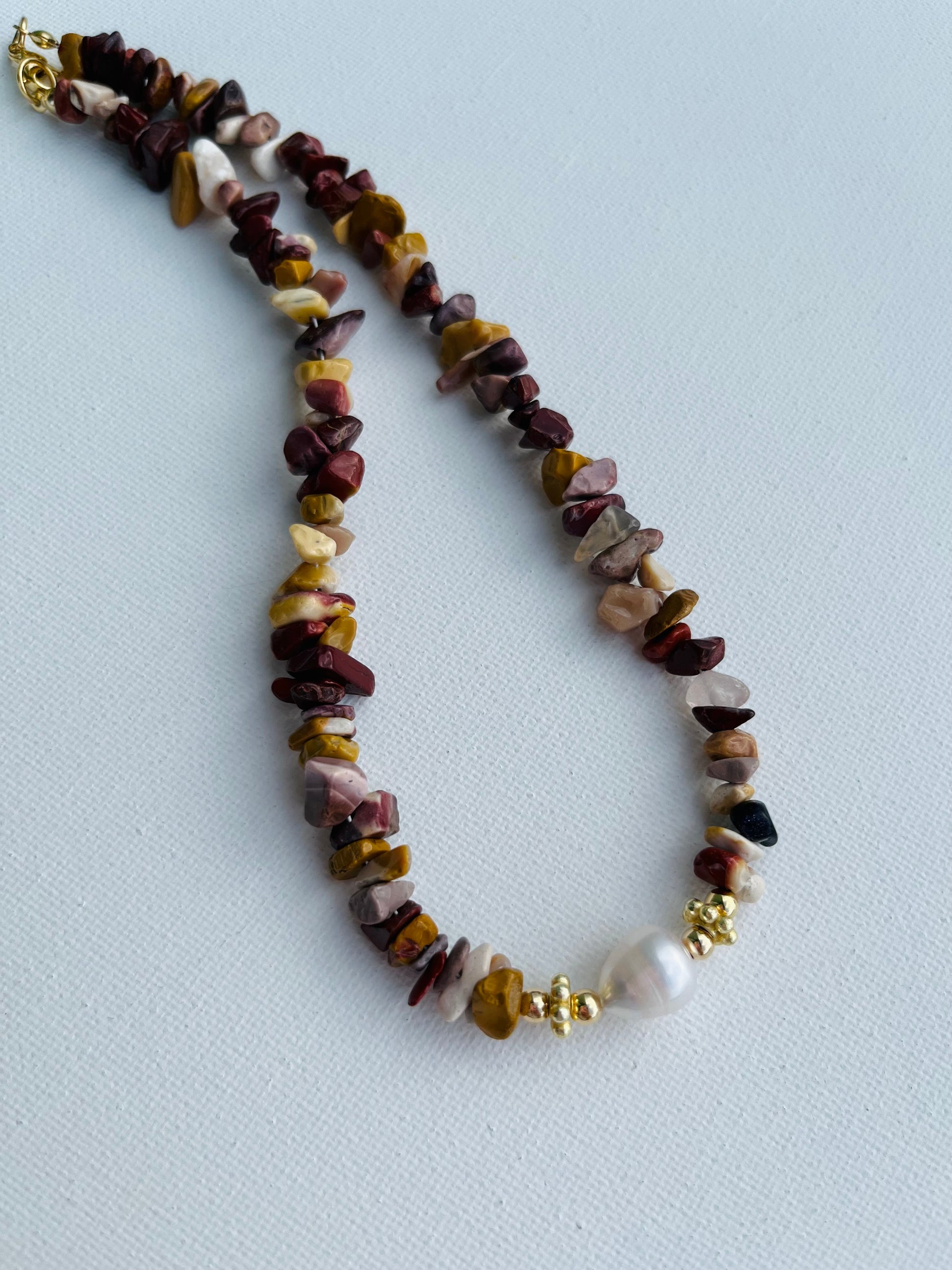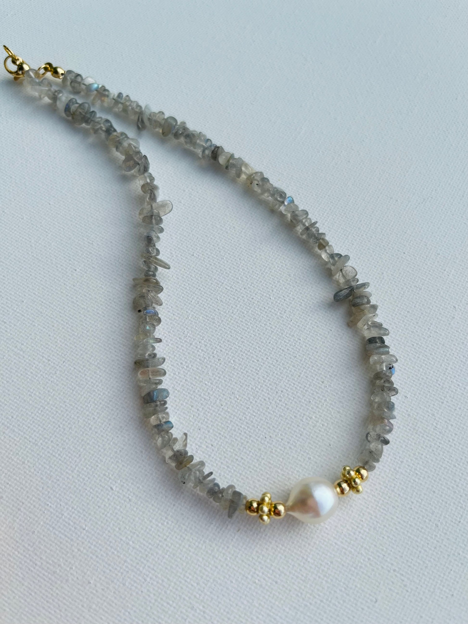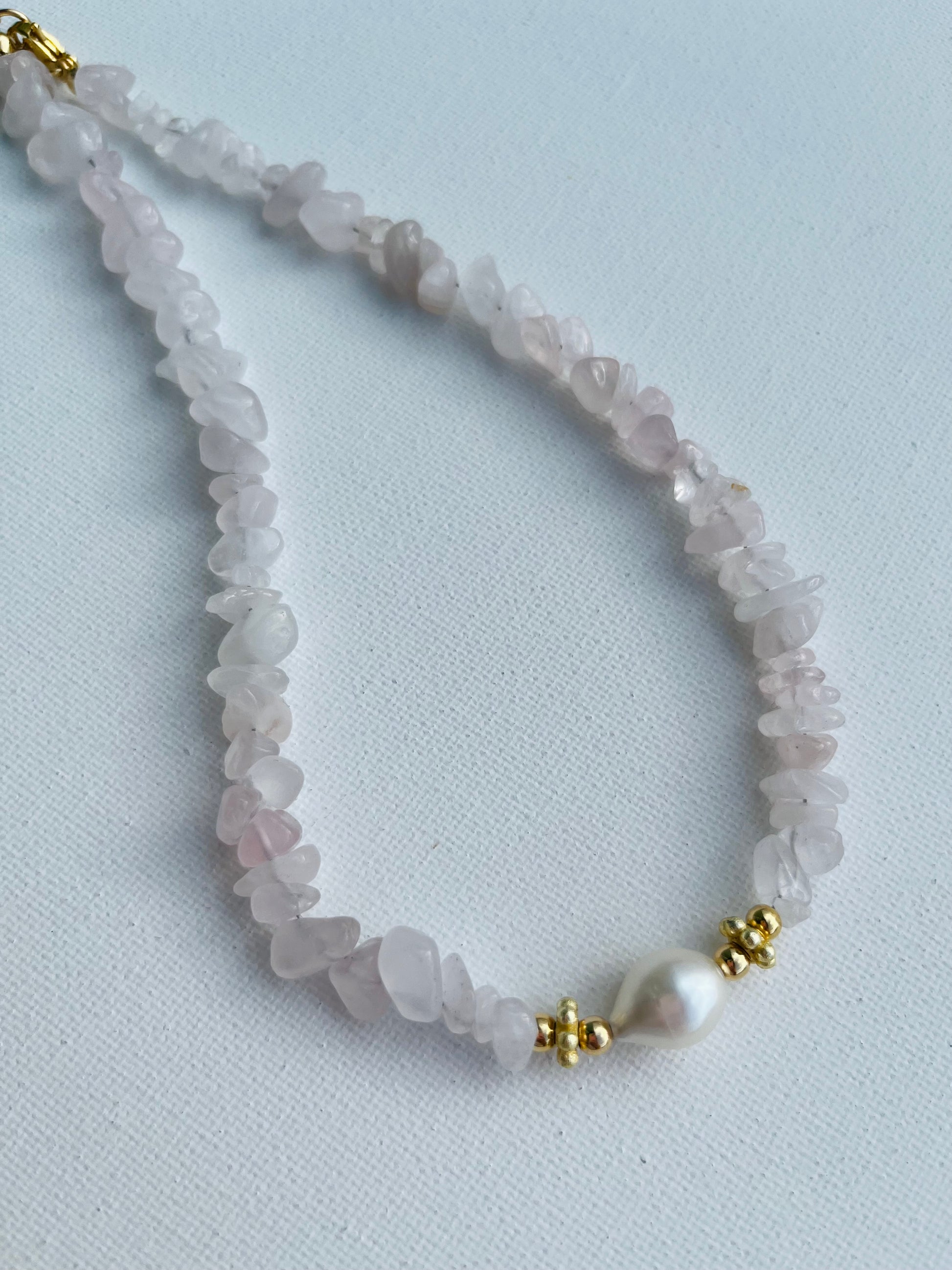 made of rose quartz chip, gray quartz and chips. Fresh water pearl with gold plated details. Measures from 16 inches long.