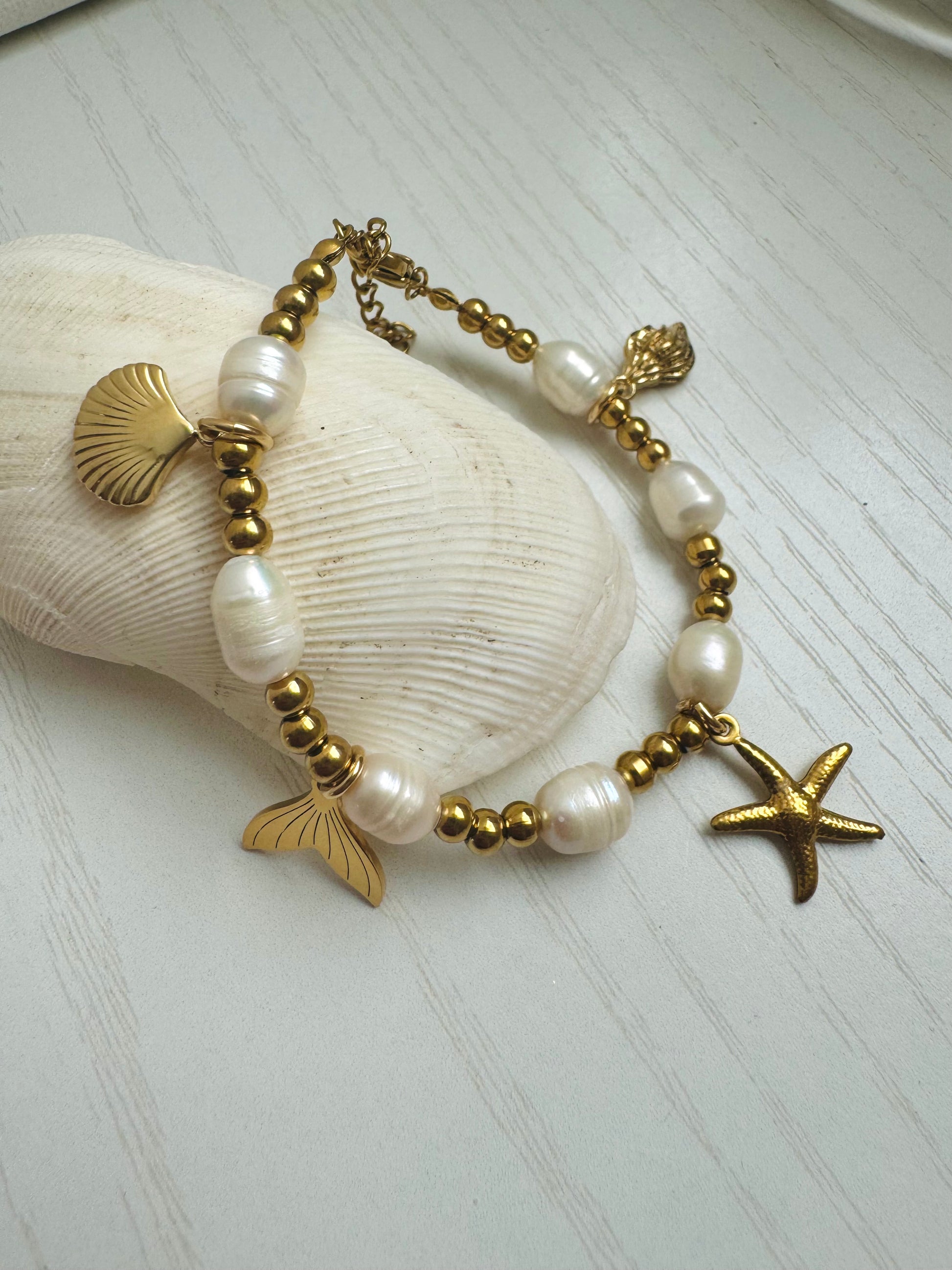 14k gold plated stainless steel beads and charms with fresh water pearls.