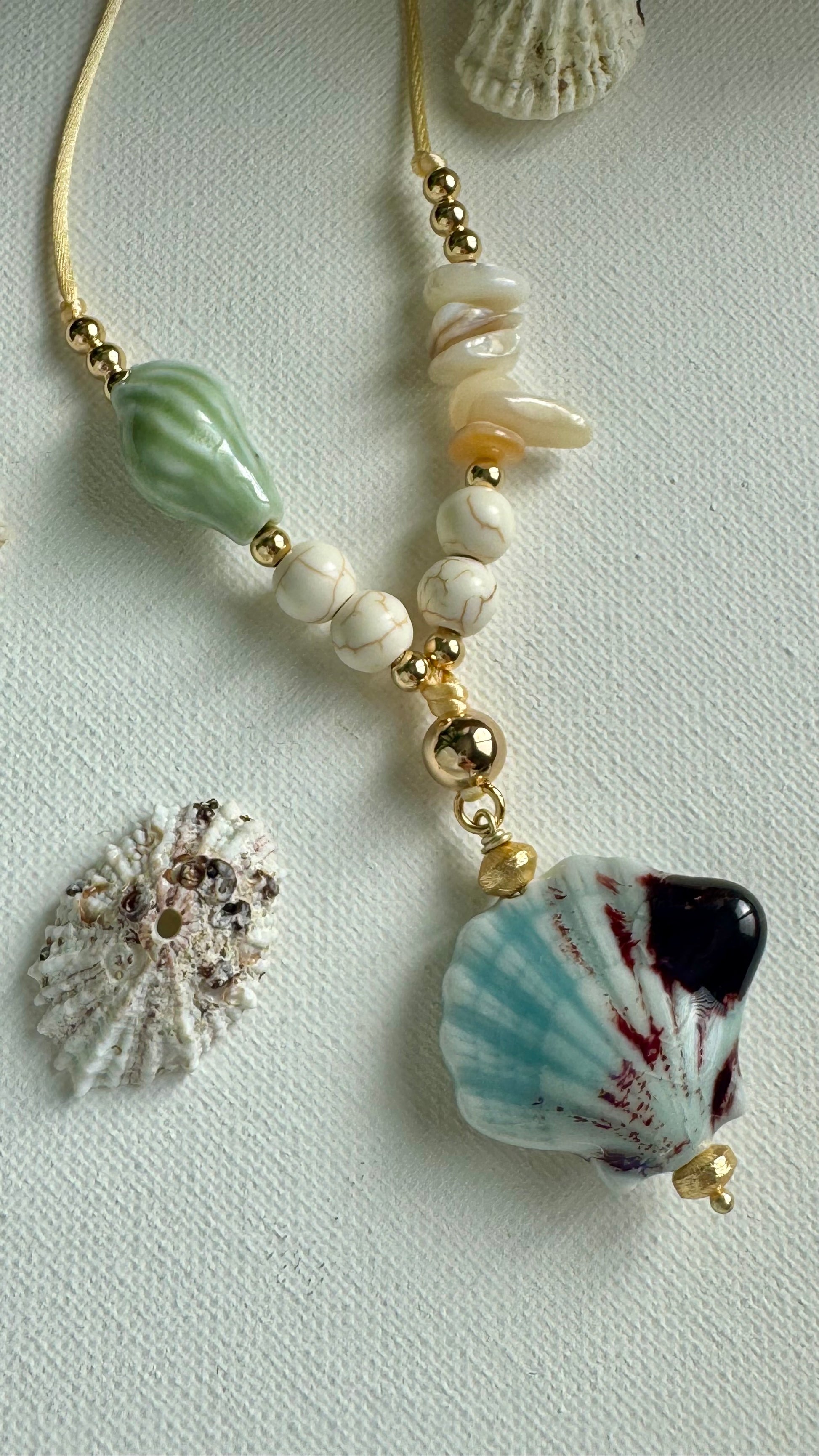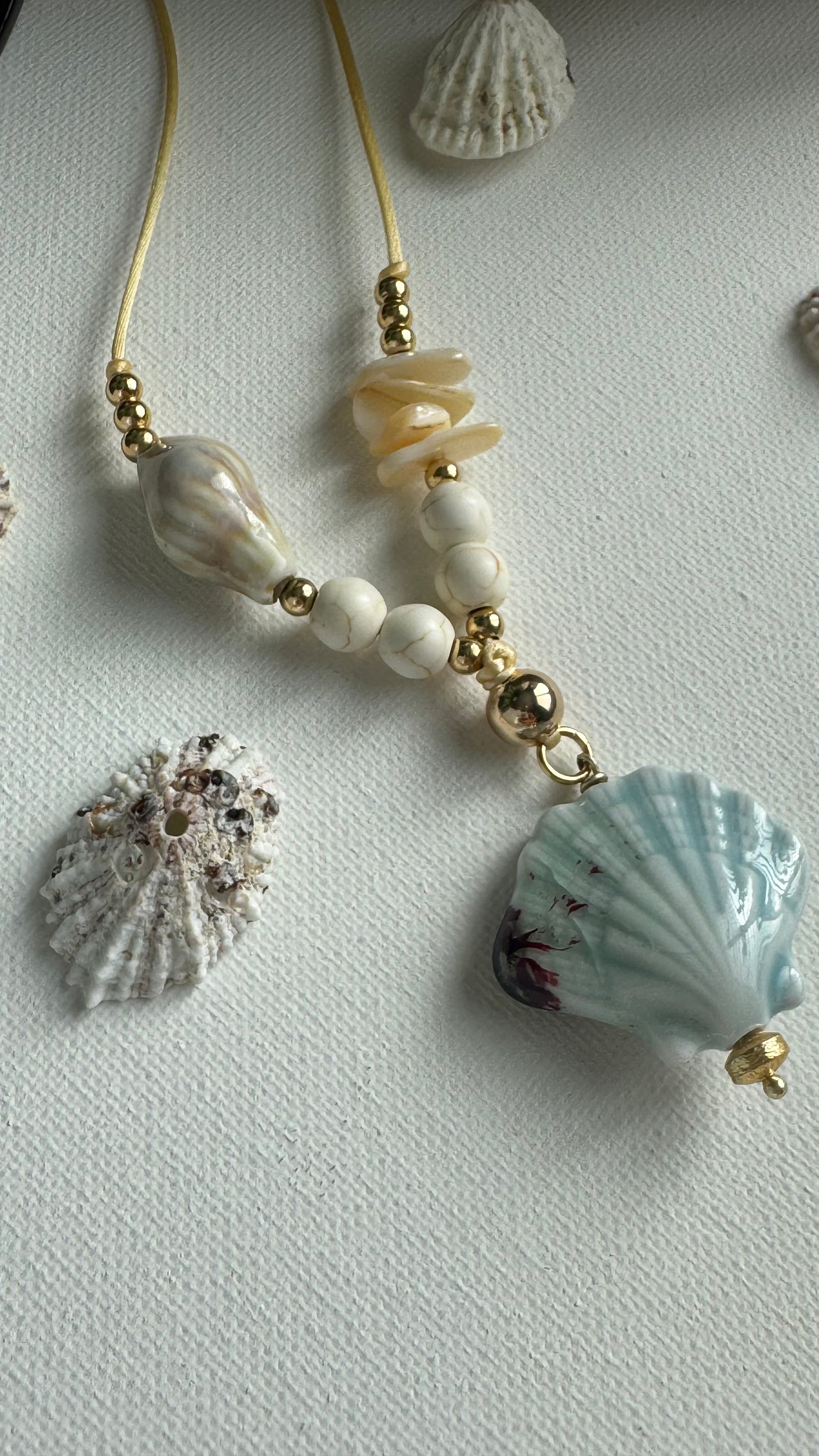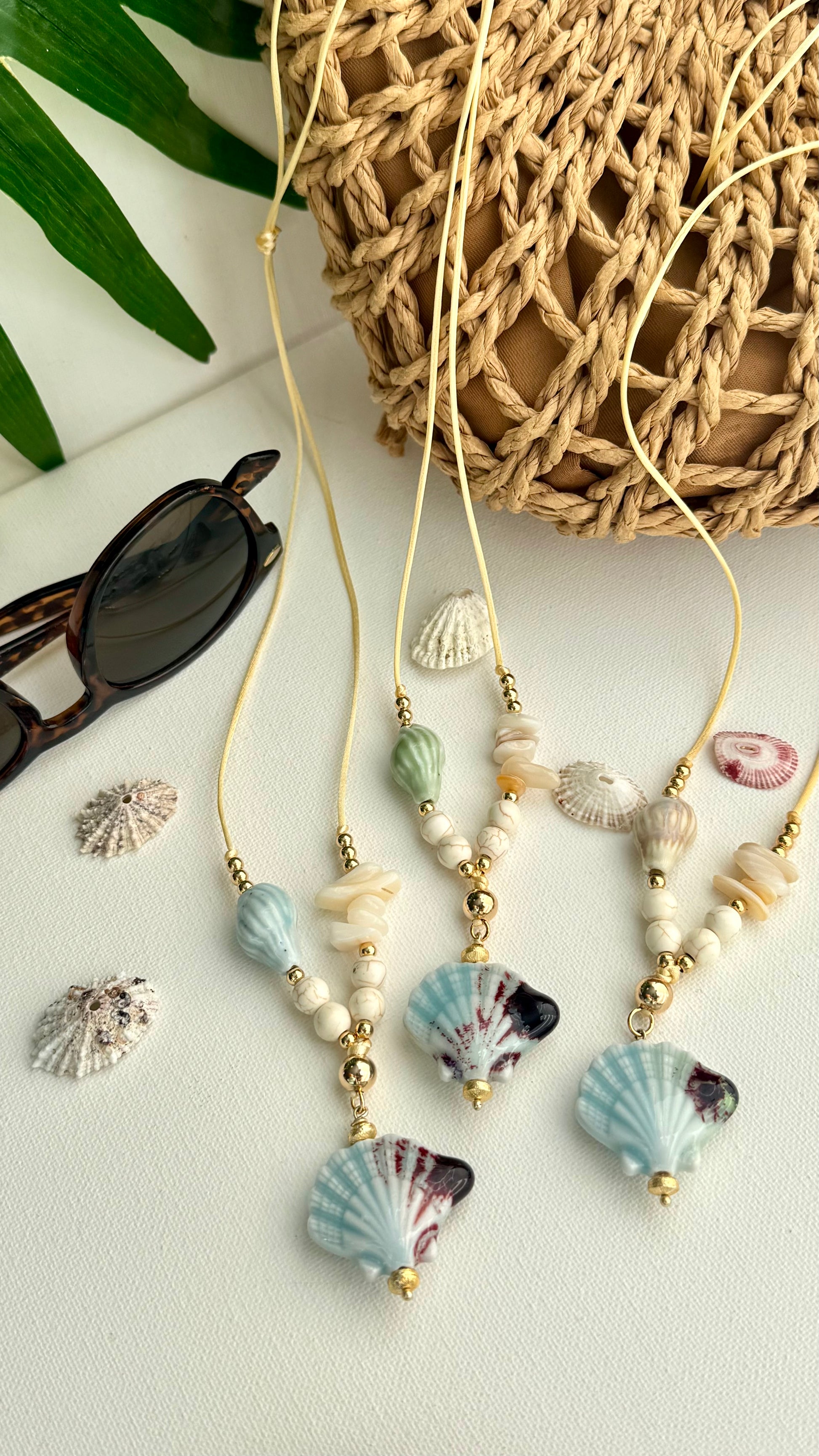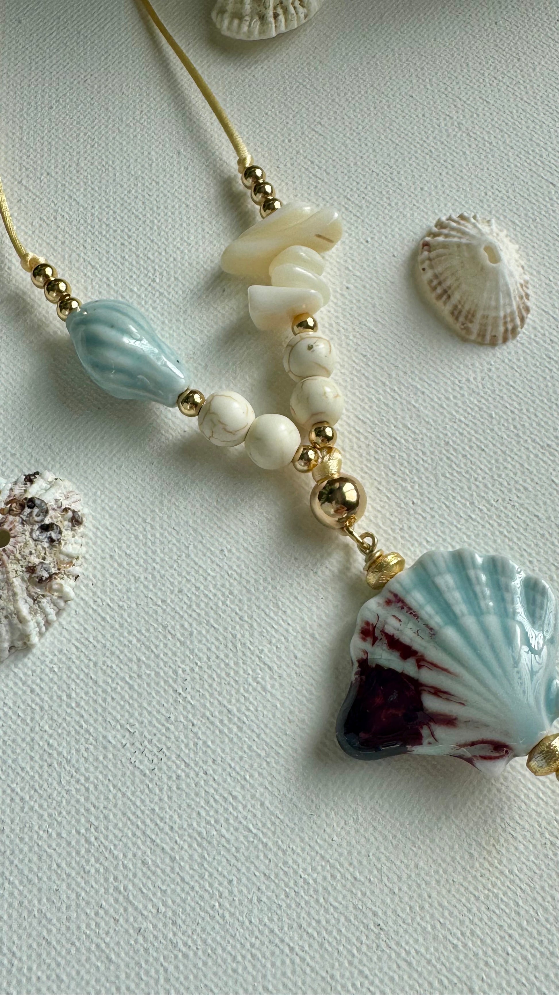 Handmade with satin cord, Ajustable, ceramic beads and shell chips.
