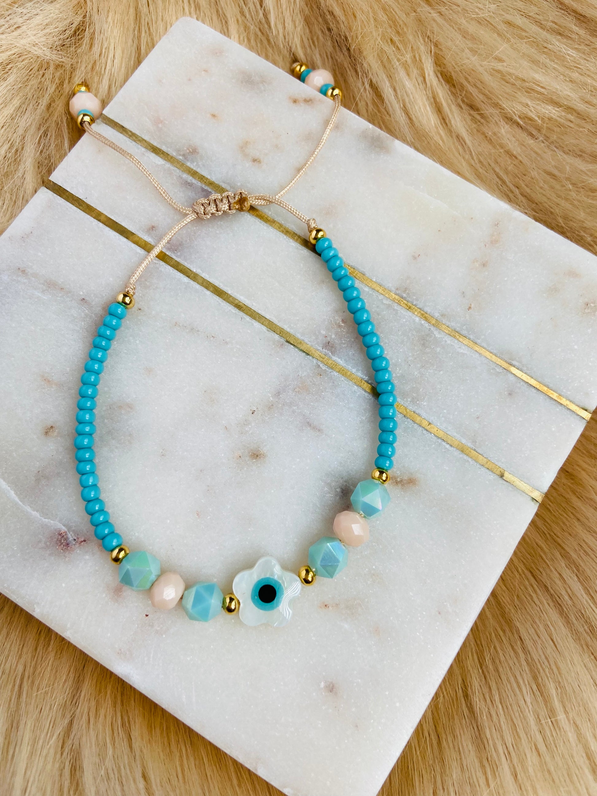 Ajustable bracelet made of sead beads, crystals and gold plated beads.