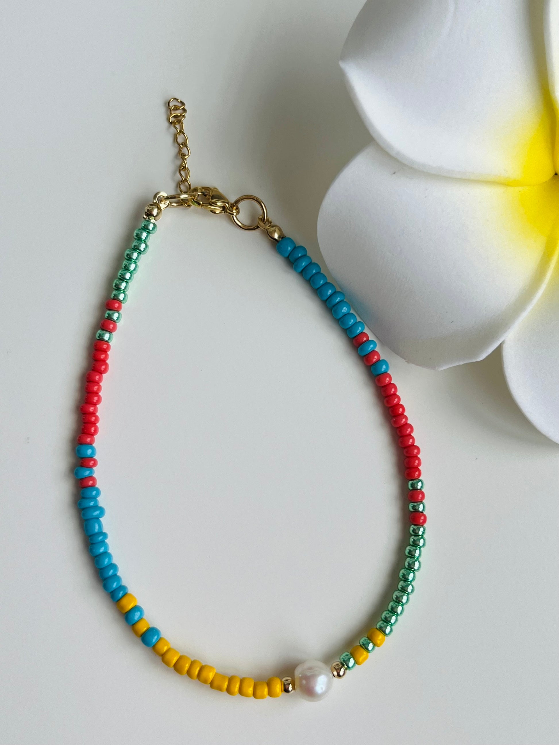 Made of miyuki seed beads, fresh water pearls and gold plated beads. Measures 8.5-9 plus extension.