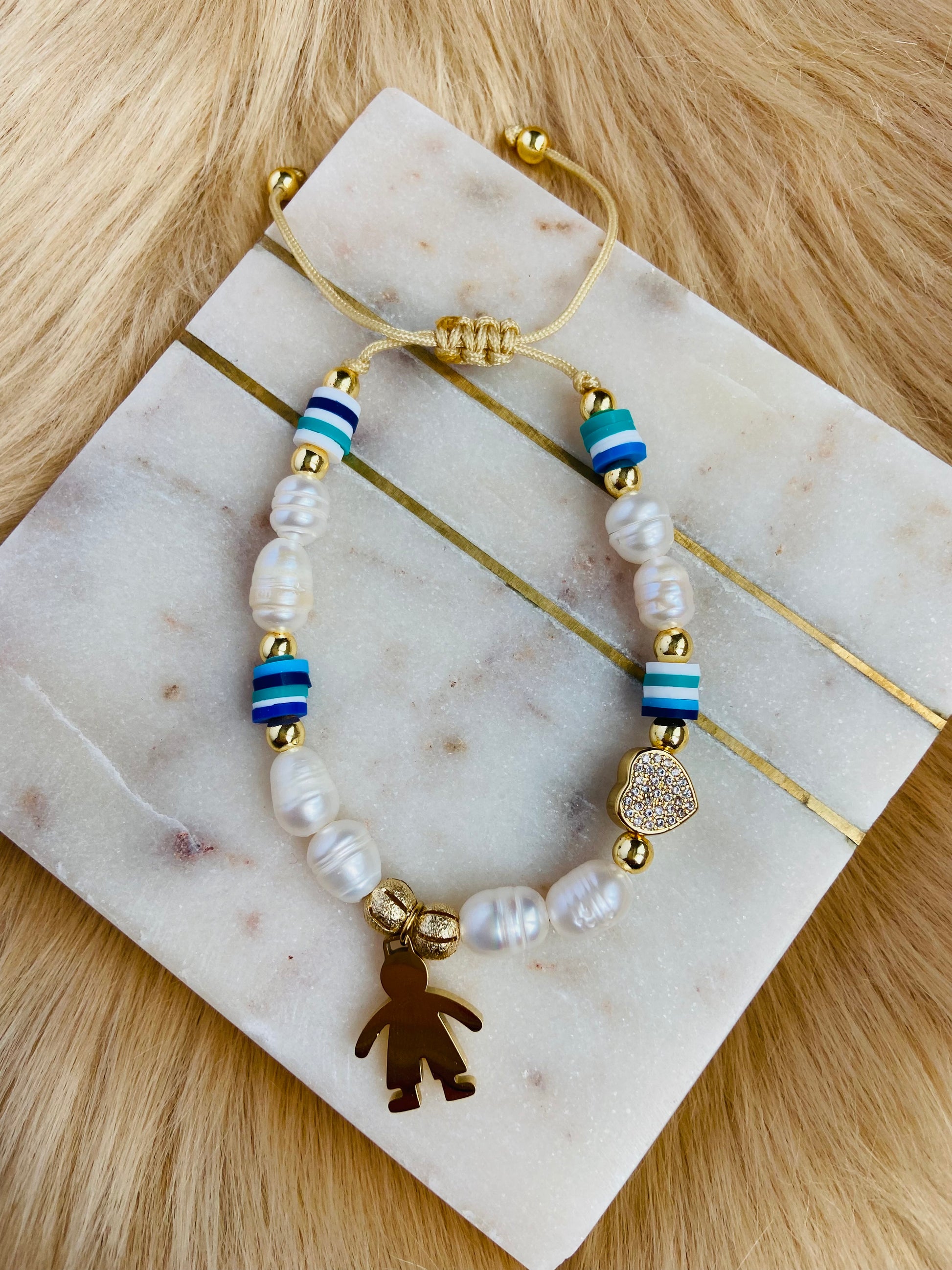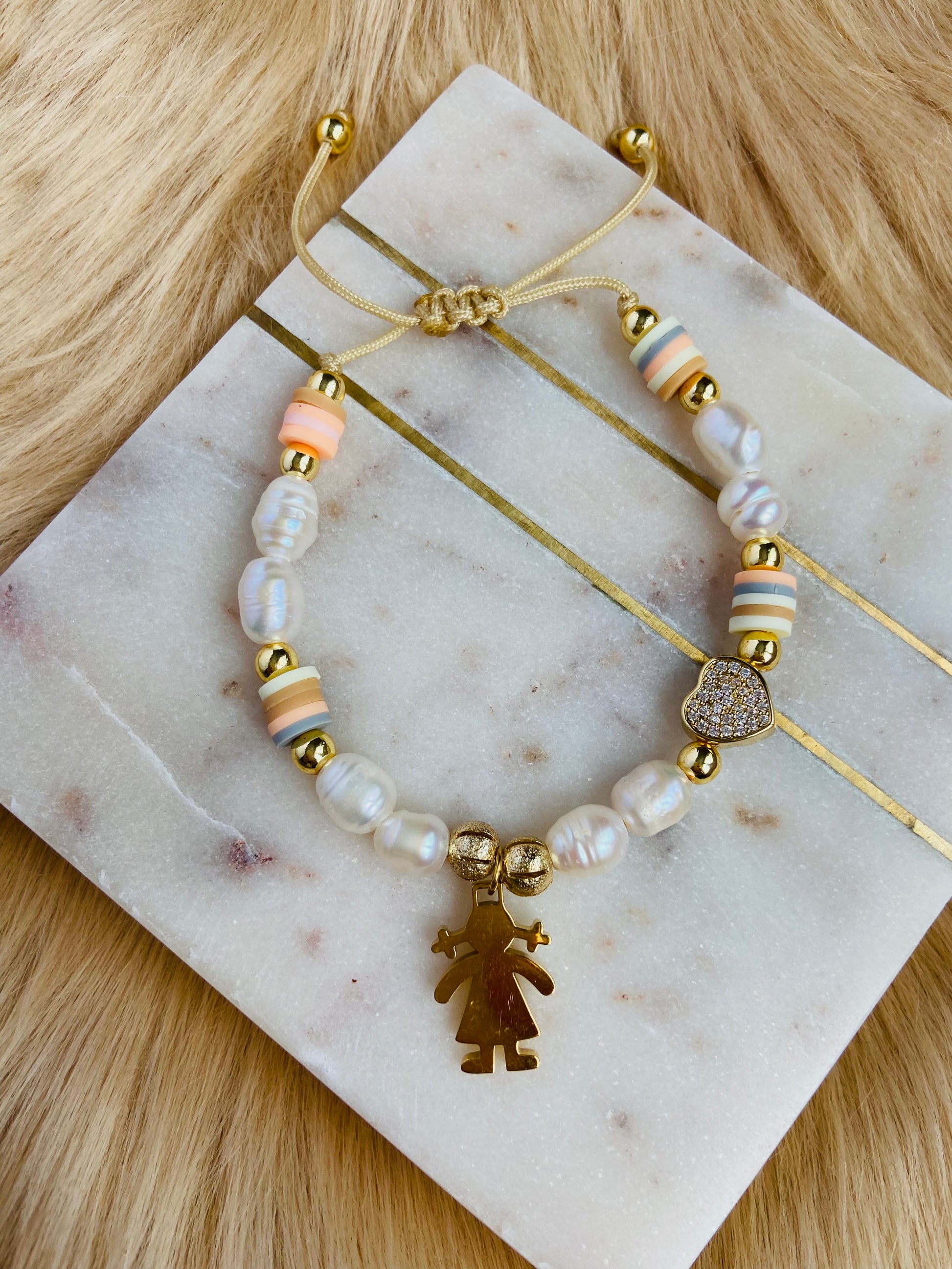 Ajustable bracelet madre of fresh water pearls stainless steel charm, polymer and hematite beads.